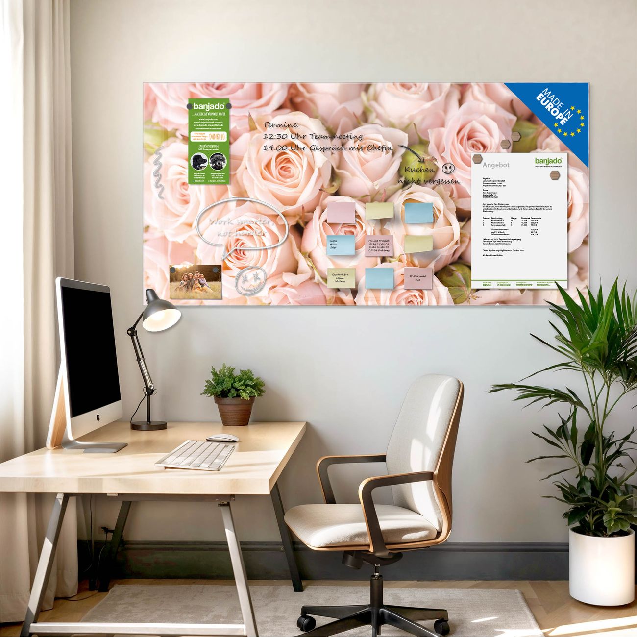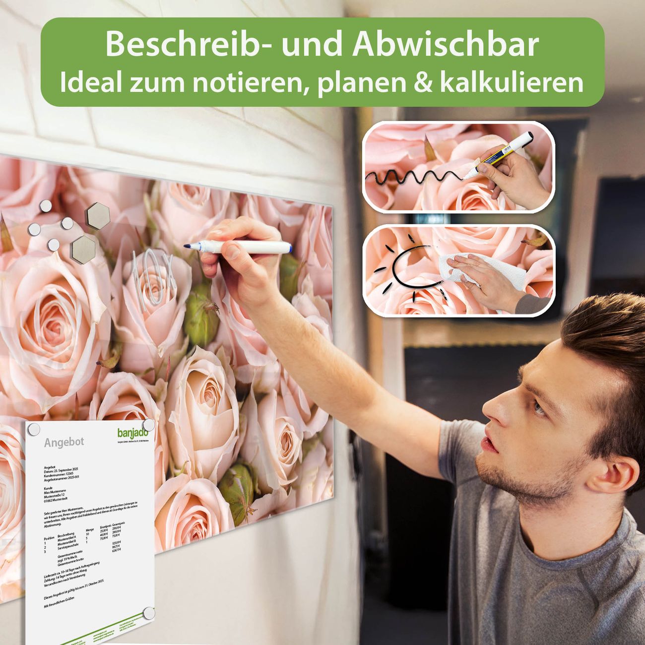 Die banjado Glas Magnettafel mit dem Motiv Motiv Rosenbouquet verbindet Funktionalität mit Stil. Sie ersetzt das Zettelchaos durch klare Strukturen und bringt dabei eine warme, natürliche Atmosphäre in Ihr Zuhause. Ob im Büro, in der Küche oder im Eingangsbereich - dieses Design-Board zieht Blicke an und sorgt für Ordnung mit Charakter.