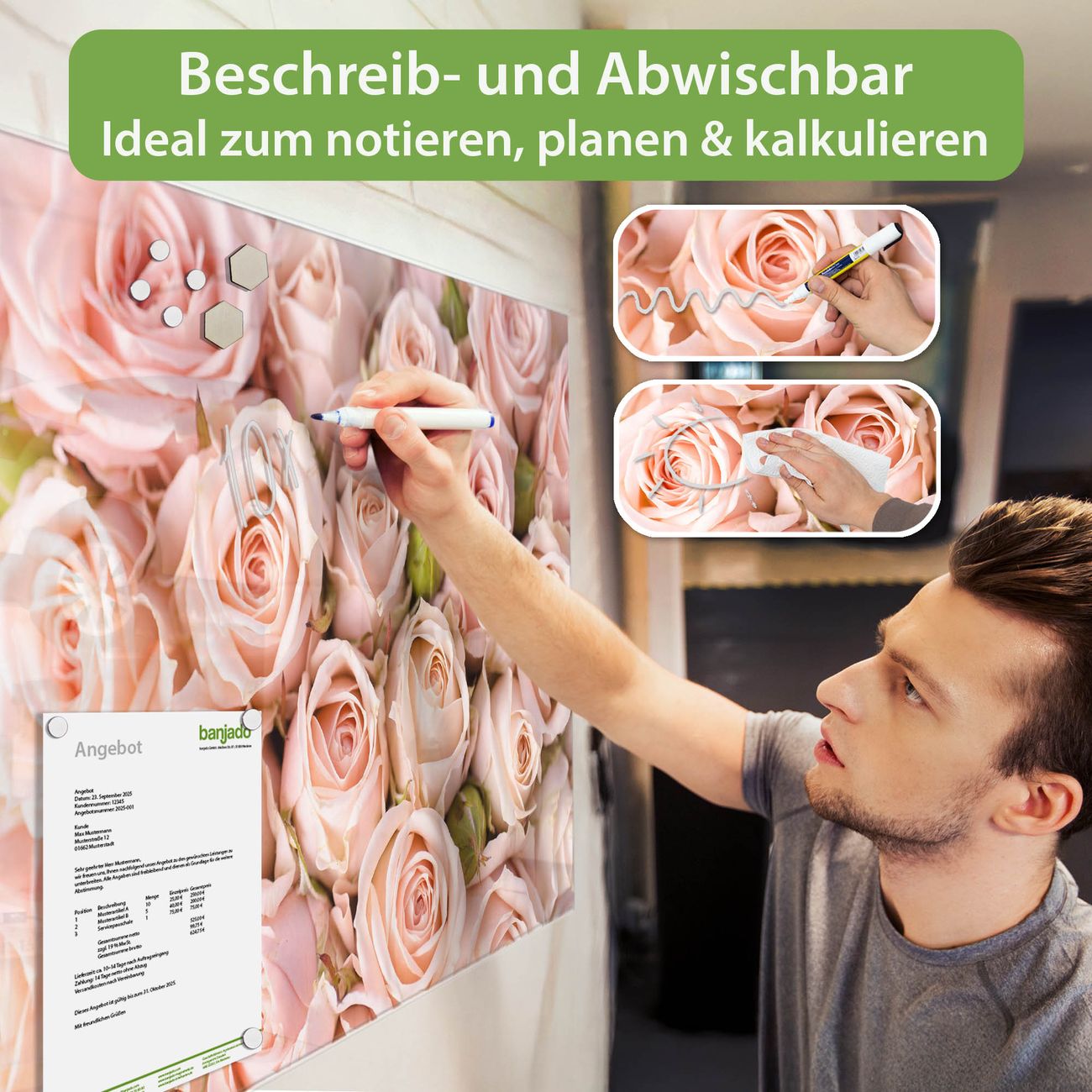 Ein Stück Design, das Ihren Alltag organisiert. Schreiben, heften, inspirieren - alles an einem Ort. Qualität, die man spürt. Montage leicht gemacht. Handwerk mit Herz - veredelt in Sachsen. Einzigartiges Design mit Motiv Motiv Rosenbouquet Beschreibbare Glasoberfläche, leicht zu reinigen Starke Magnetkraft durch Stahlrückwand Inklusive 4 Neodym-Magneten Flexible Montageoptionen Handveredelt in Sachsen - Qualität, die bleibt
