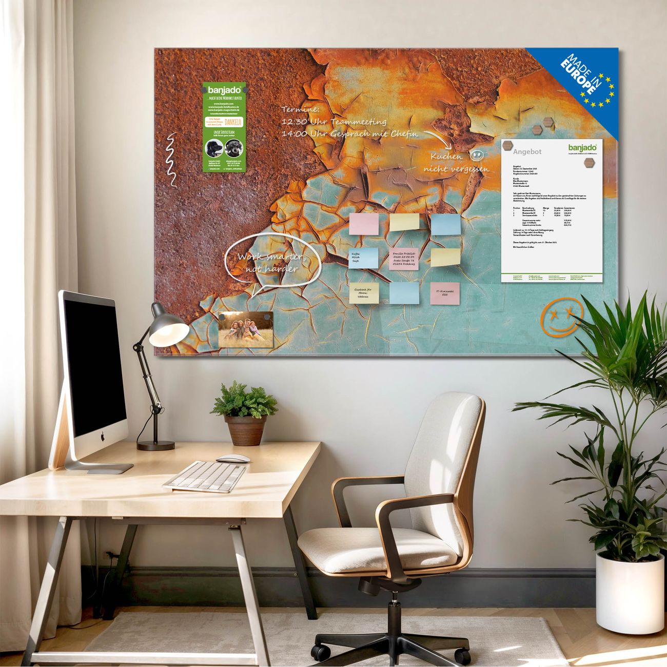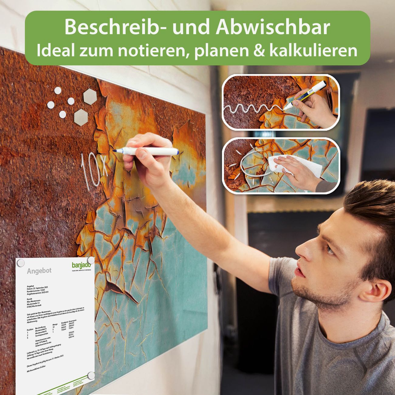 Die banjado Glas Magnettafel mit dem Motiv Motiv Rost und Blau verbindet Funktionalität mit Stil. Sie ersetzt das Zettelchaos durch klare Strukturen und bringt dabei eine warme, natürliche Atmosphäre in Ihr Zuhause. Ob im Büro, in der Küche oder im Eingangsbereich - dieses Design-Board zieht Blicke an und sorgt für Ordnung mit Charakter.