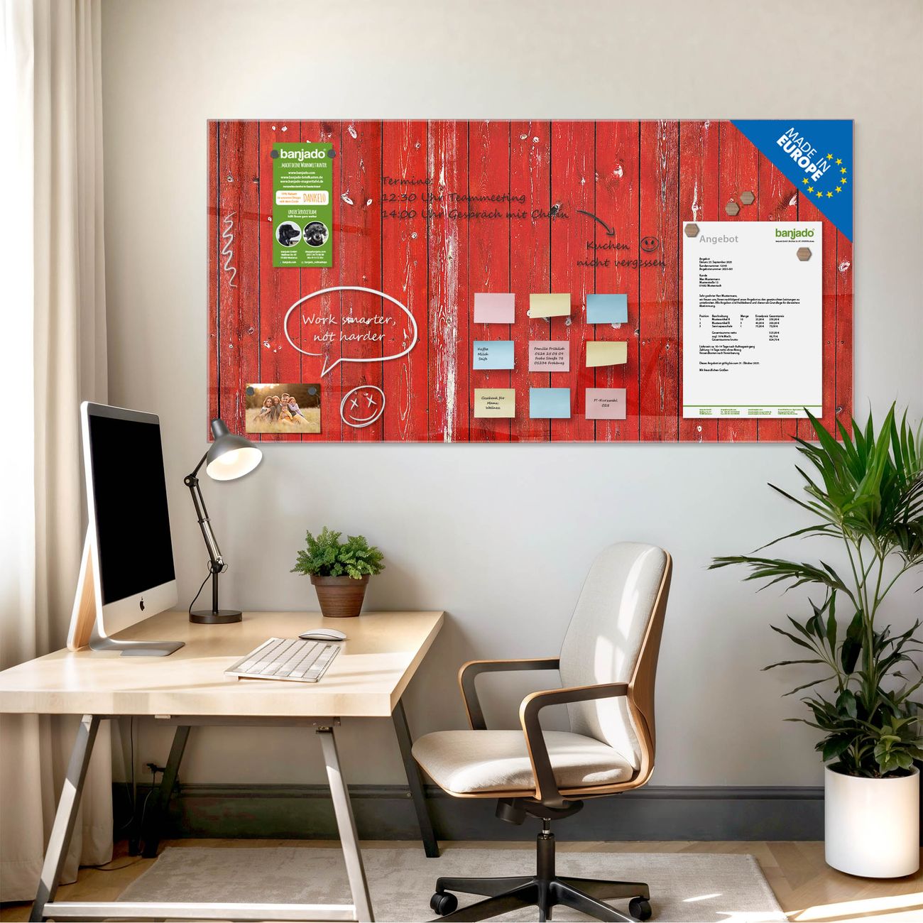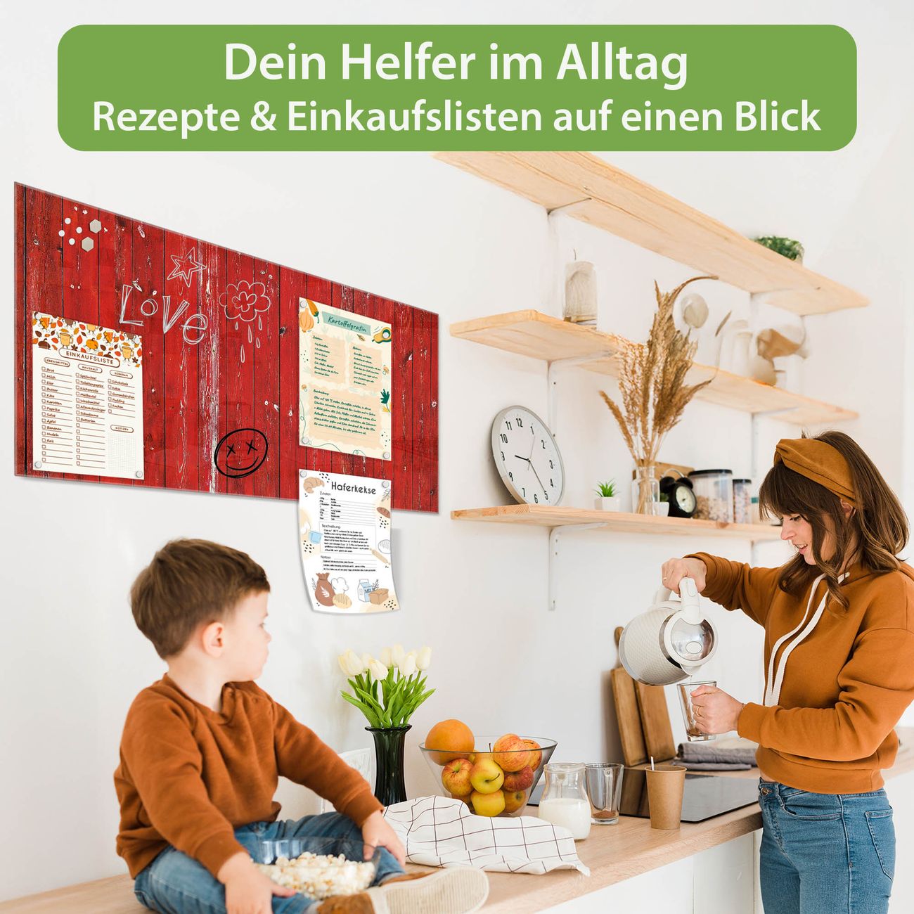 Ein Stück Design, das Ihren Alltag organisiert. Schreiben, heften, inspirieren - alles an einem Ort. Qualität, die man spürt. Montage leicht gemacht. Handwerk mit Herz - veredelt in Sachsen. Einzigartiges Design mit Motiv Motiv Rote Holzlatten Beschreibbare Glasoberfläche, leicht zu reinigen Starke Magnetkraft durch Stahlrückwand Inklusive 4 Neodym-Magneten Flexible Montageoptionen Handveredelt in Sachsen - Qualität, die bleibt