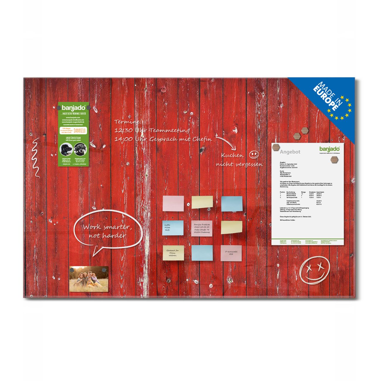 Ein Stück Design, das Ihren Alltag organisiert. Schreiben, heften, inspirieren - alles an einem Ort. Qualität, die man spürt. Montage leicht gemacht. Handwerk mit Herz - veredelt in Sachsen. Einzigartiges Design mit Motiv Motiv Rote Holzlatten Beschreibbare Glasoberfläche, leicht zu reinigen Starke Magnetkraft durch Stahlrückwand Inklusive 4 Neodym-Magneten Flexible Montageoptionen Handveredelt in Sachsen - Qualität, die bleibt