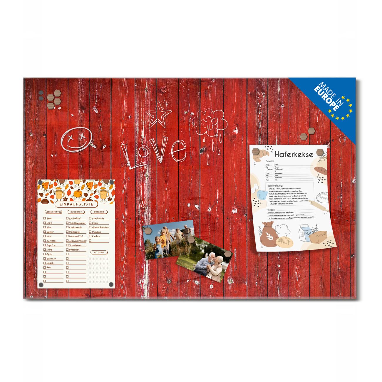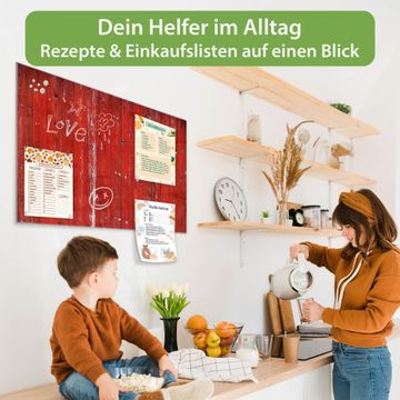 Ein Stück Design, das Ihren Alltag organisiert. Schreiben, heften, inspirieren - alles an einem Ort. Qualität, die man spürt. Montage leicht gemacht. Handwerk mit Herz - veredelt in Sachsen. Einzigartiges Design mit Motiv Motiv Rote Holzlatten Beschreibbare Glasoberfläche, leicht zu reinigen Starke Magnetkraft durch Stahlrückwand Inklusive 4 Neodym-Magneten Flexible Montageoptionen Handveredelt in Sachsen - Qualität, die bleibt