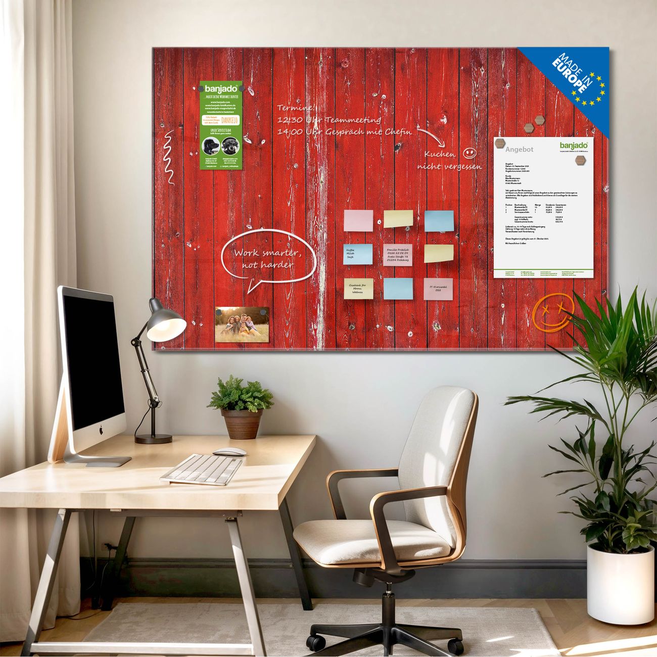 Jede Glas Magnettafel wird in unserer Werkstatt von Hand gefertigt und sorgfältig geprüft. So erhalten Sie ein echtes Qualitätsprodukt, das Funktion und Ästhetik perfekt vereint.?? Warum banjado?