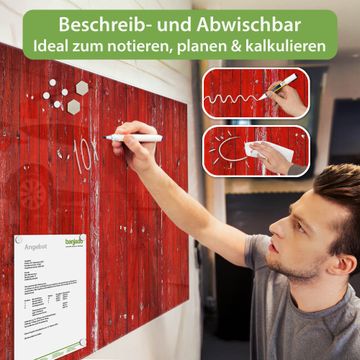 Die banjado Glas Magnettafel mit dem Motiv Motiv Rote Holzlatten verbindet Funktionalität mit Stil. Sie ersetzt das Zettelchaos durch klare Strukturen und bringt dabei eine warme, natürliche Atmosphäre in Ihr Zuhause. Ob im Büro, in der Küche oder im Eingangsbereich - dieses Design-Board zieht Blicke an und sorgt für Ordnung mit Charakter.