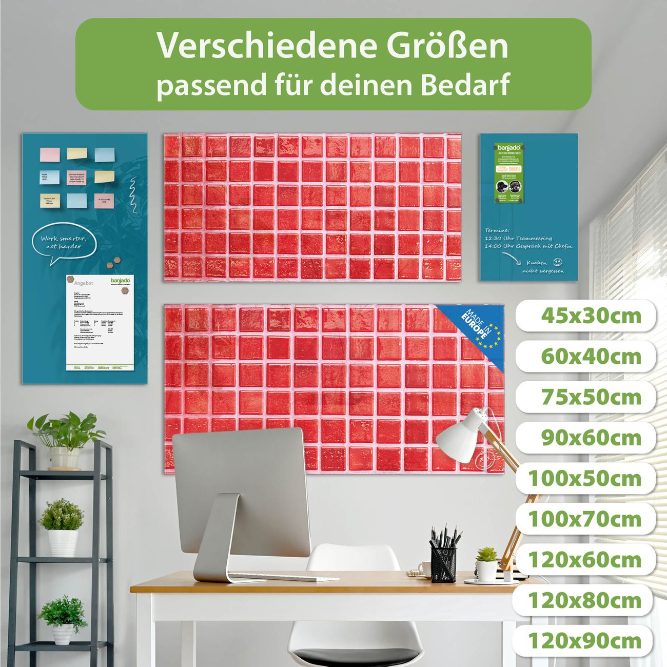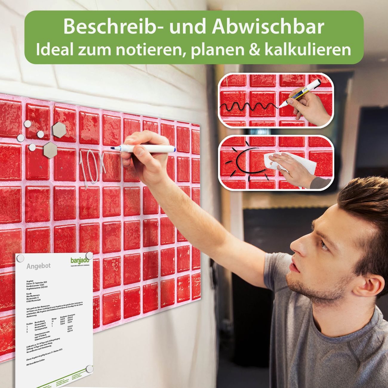 Jede Glas Magnettafel wird in unserer Werkstatt von Hand gefertigt und sorgfältig geprüft. So erhalten Sie ein echtes Qualitätsprodukt, das Funktion und Ästhetik perfekt vereint.?? Warum banjado?