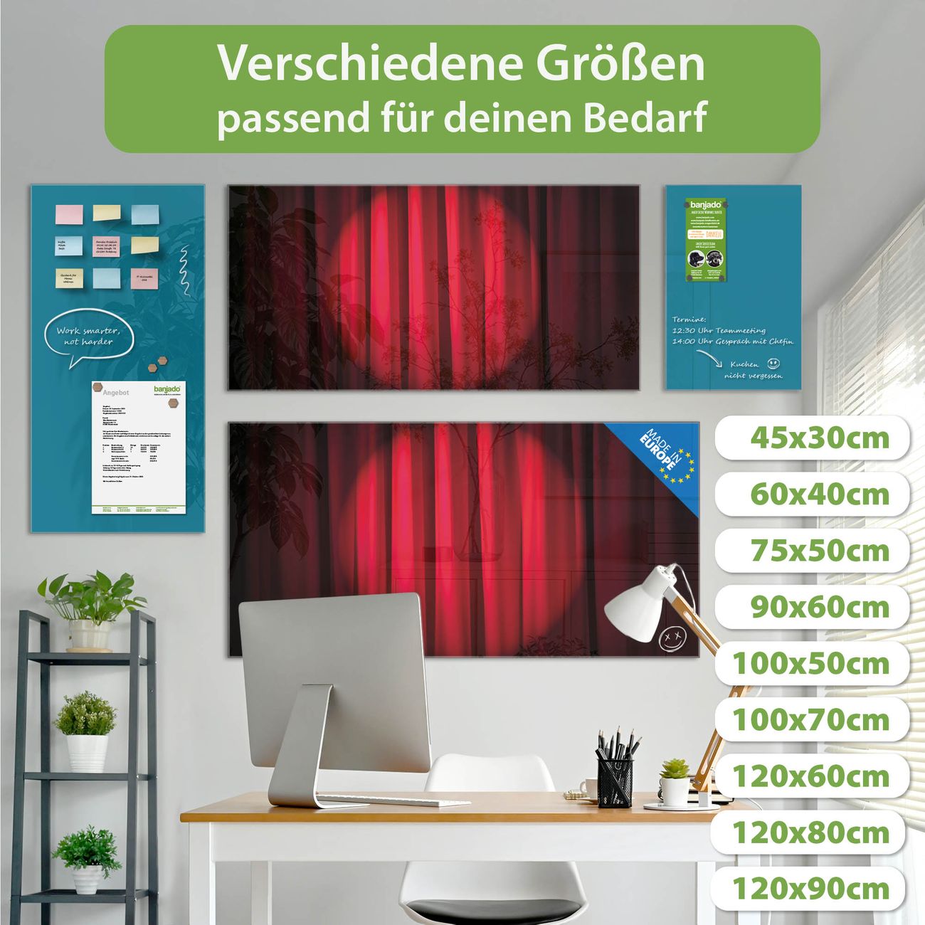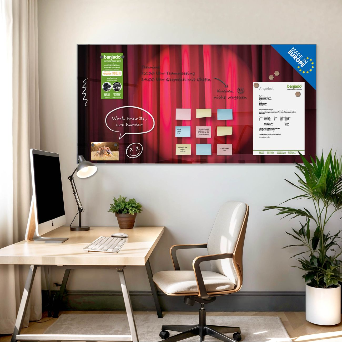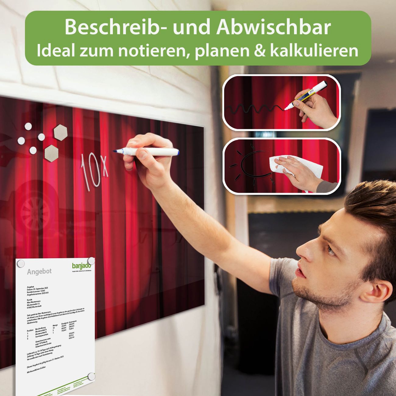 Jede Glas Magnettafel wird in unserer Werkstatt von Hand gefertigt und sorgfältig geprüft. So erhalten Sie ein echtes Qualitätsprodukt, das Funktion und Ästhetik perfekt vereint.?? Warum banjado?