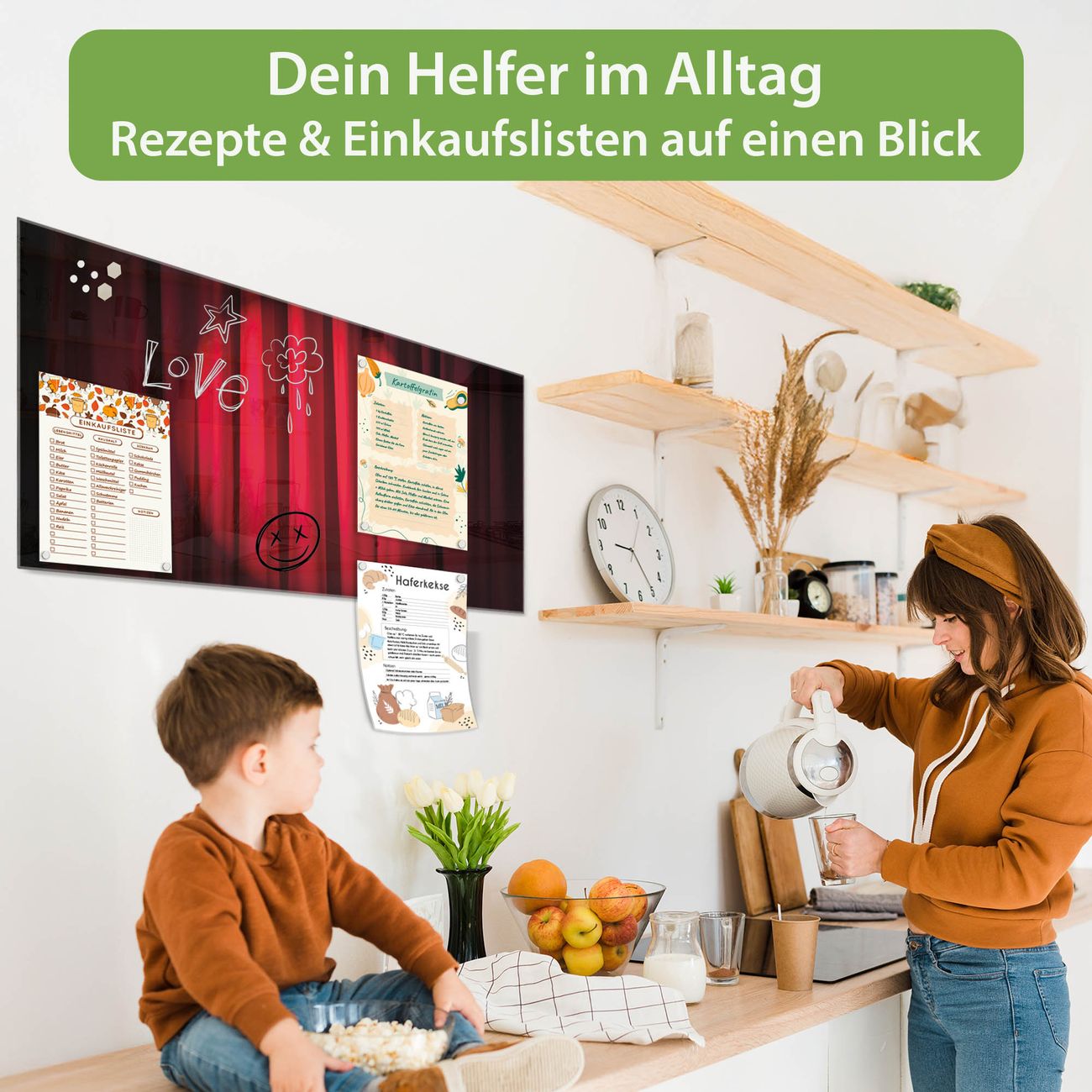 Auf der glatten Glasoberfläche lassen sich Termine, Rezepte oder Notizen ganz einfach mit Kreidestiften festhalten und rückstandslos entfernen. Starke Neodym-Magnete halten Ihre wichtigsten Erinnerungen sicher an Ort und Stelle. So entsteht Ihre ganz persönliche Ideenwand - jeden Tag neu.