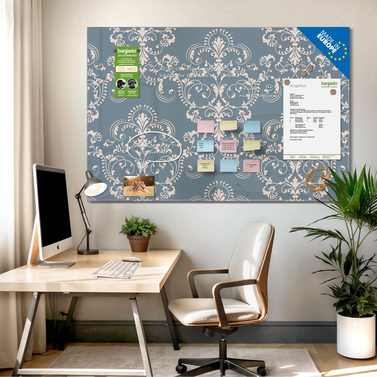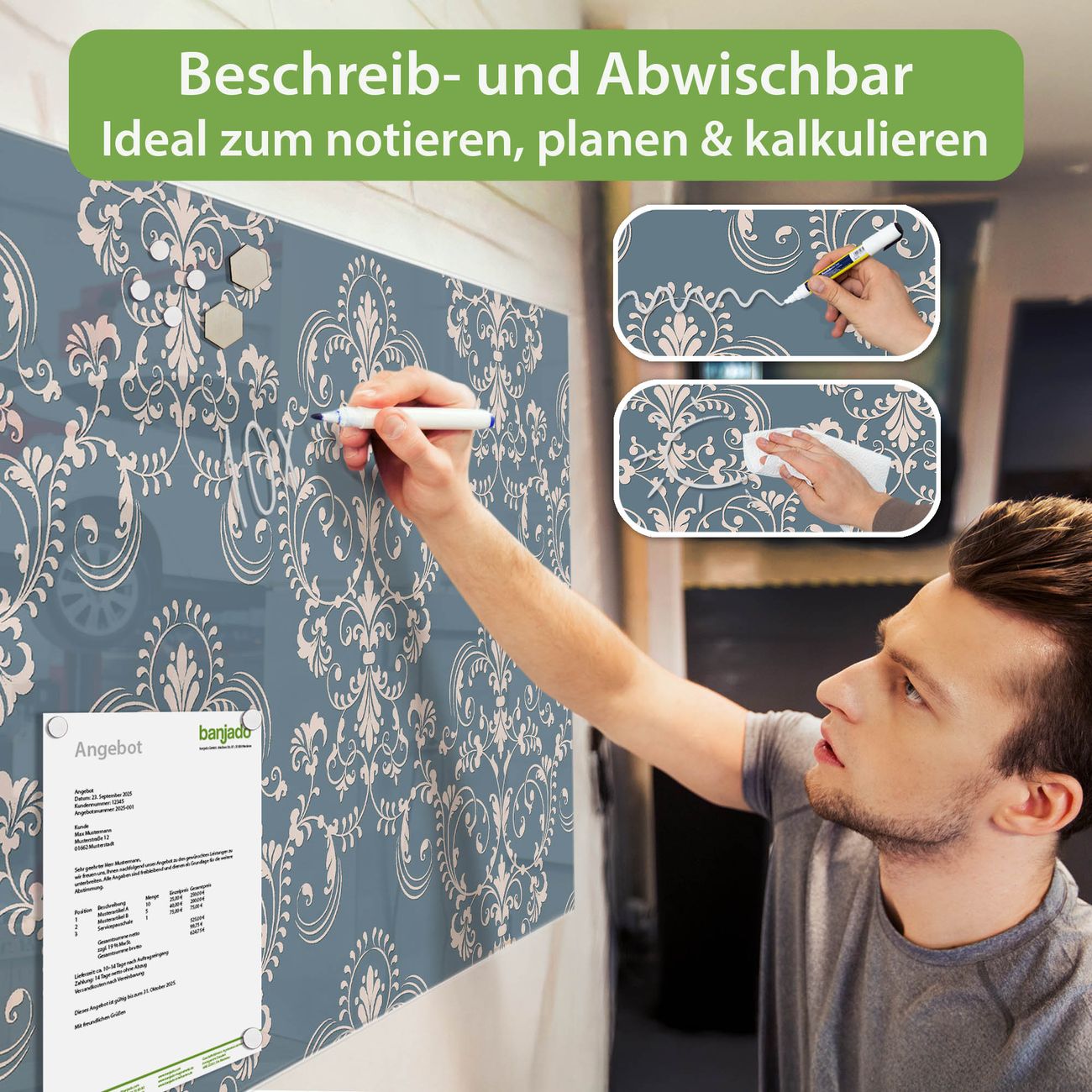 Die banjado Glas Magnettafel mit dem Motiv Motiv Royal Creme Blau verbindet Funktionalität mit Stil. Sie ersetzt das Zettelchaos durch klare Strukturen und bringt dabei eine warme, natürliche Atmosphäre in Ihr Zuhause. Ob im Büro, in der Küche oder im Eingangsbereich - dieses Design-Board zieht Blicke an und sorgt für Ordnung mit Charakter.
