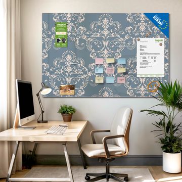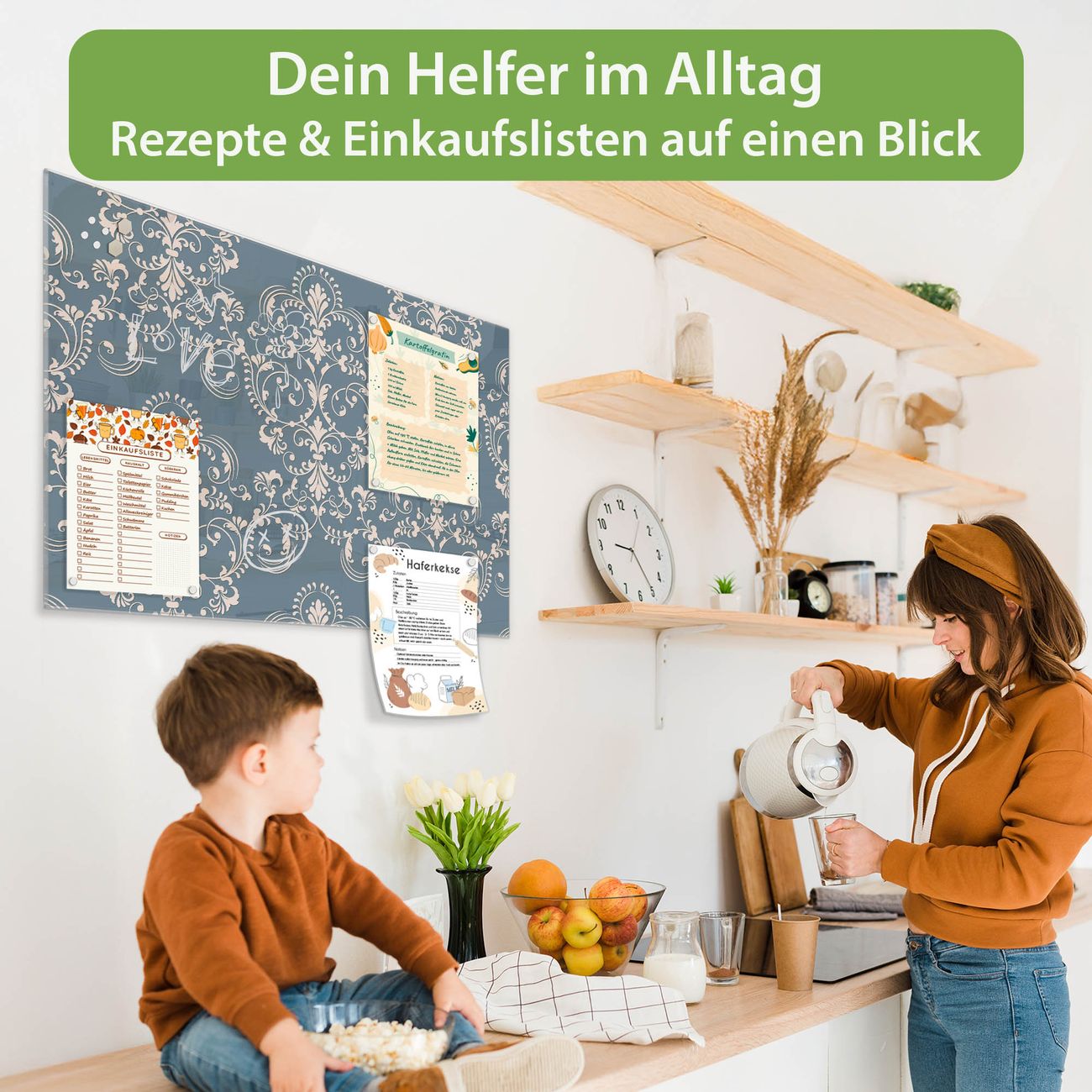 Ein Stück Design, das Ihren Alltag organisiert. Schreiben, heften, inspirieren - alles an einem Ort. Qualität, die man spürt. Montage leicht gemacht. Handwerk mit Herz - veredelt in Sachsen. Einzigartiges Design mit Motiv Motiv Royal Creme Blau Beschreibbare Glasoberfläche, leicht zu reinigen Starke Magnetkraft durch Stahlrückwand Inklusive 4 Neodym-Magneten Flexible Montageoptionen Handveredelt in Sachsen - Qualität, die bleibt