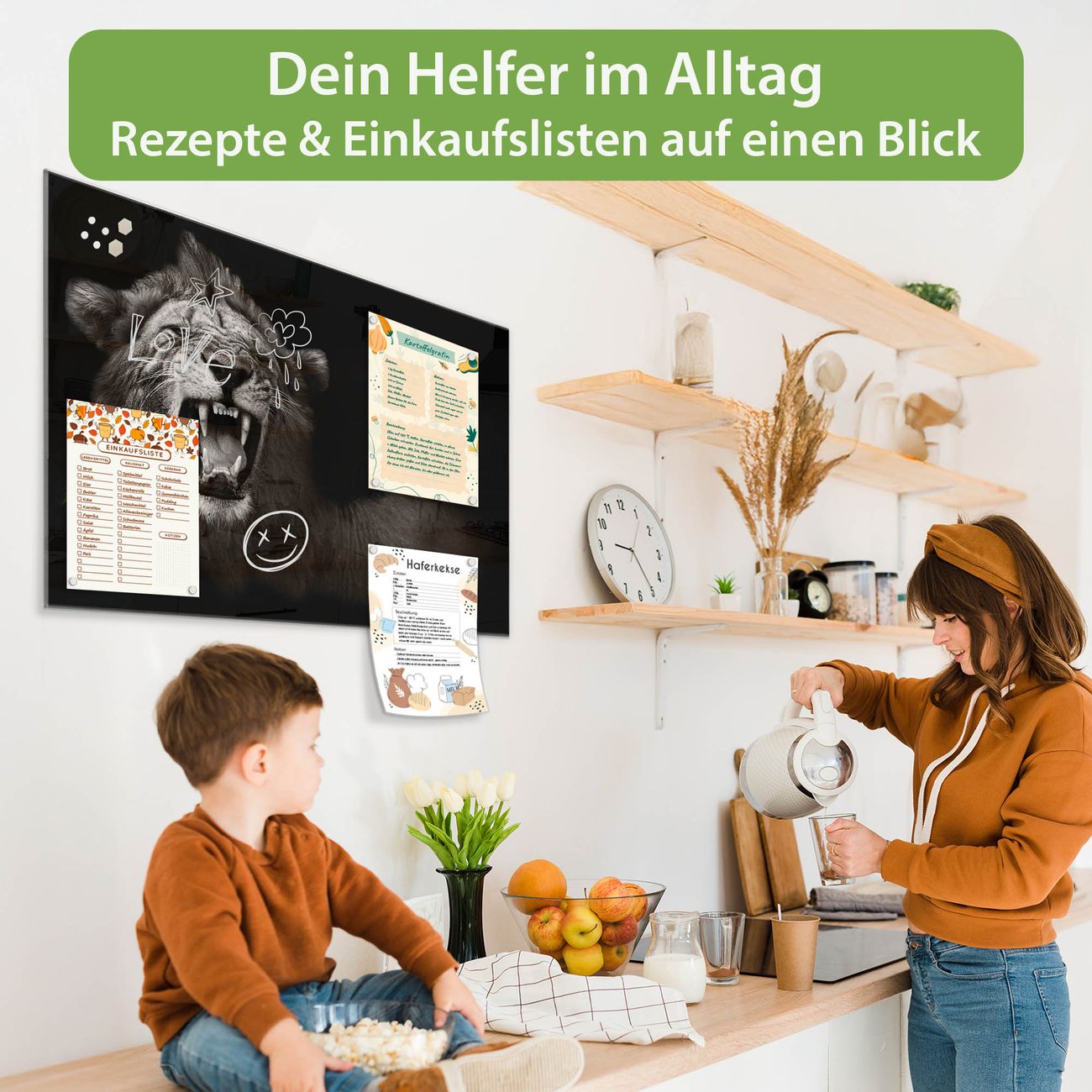 Auf der glatten Glasoberfläche lassen sich Termine, Rezepte oder Notizen ganz einfach mit Kreidestiften festhalten und rückstandslos entfernen. Starke Neodym-Magnete halten Ihre wichtigsten Erinnerungen sicher an Ort und Stelle. So entsteht Ihre ganz persönliche Ideenwand - jeden Tag neu.