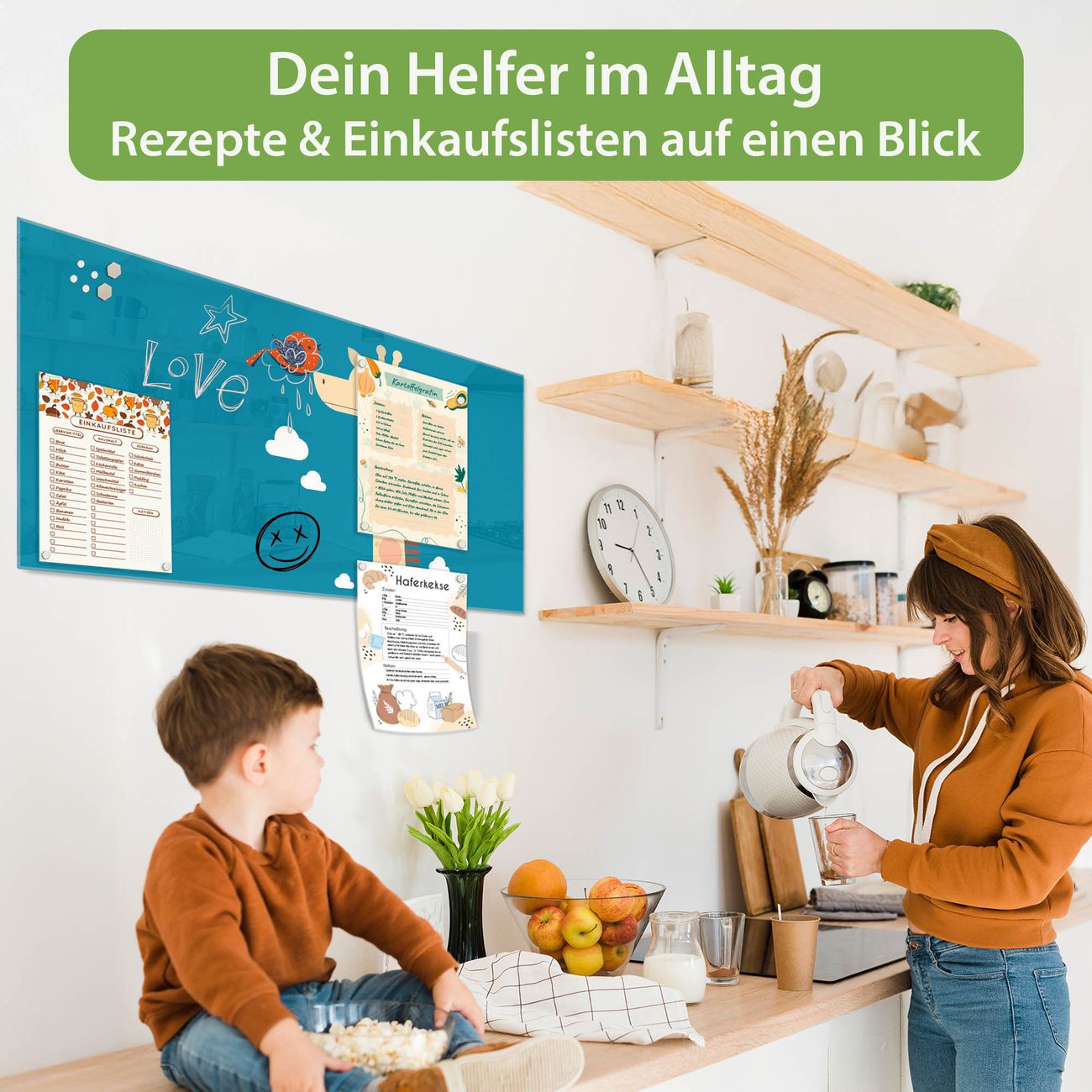 Auf der glatten Glasoberfläche lassen sich Termine, Rezepte oder Notizen ganz einfach mit Kreidestiften festhalten und rückstandslos entfernen. Starke Neodym-Magnete halten Ihre wichtigsten Erinnerungen sicher an Ort und Stelle. So entsteht Ihre ganz persönliche Ideenwand - jeden Tag neu.