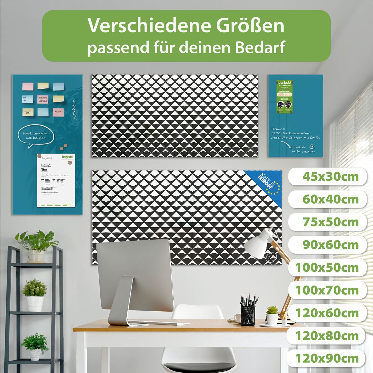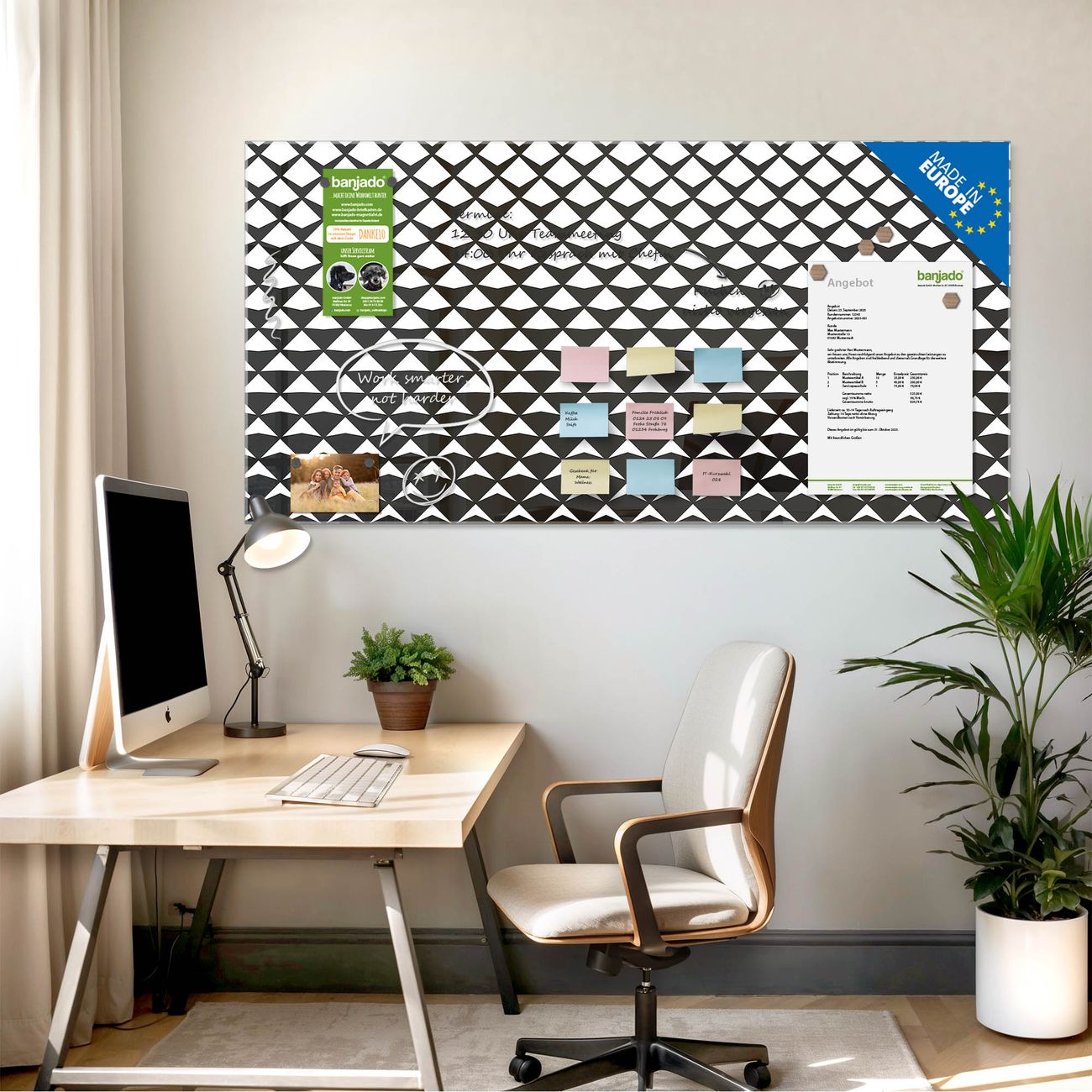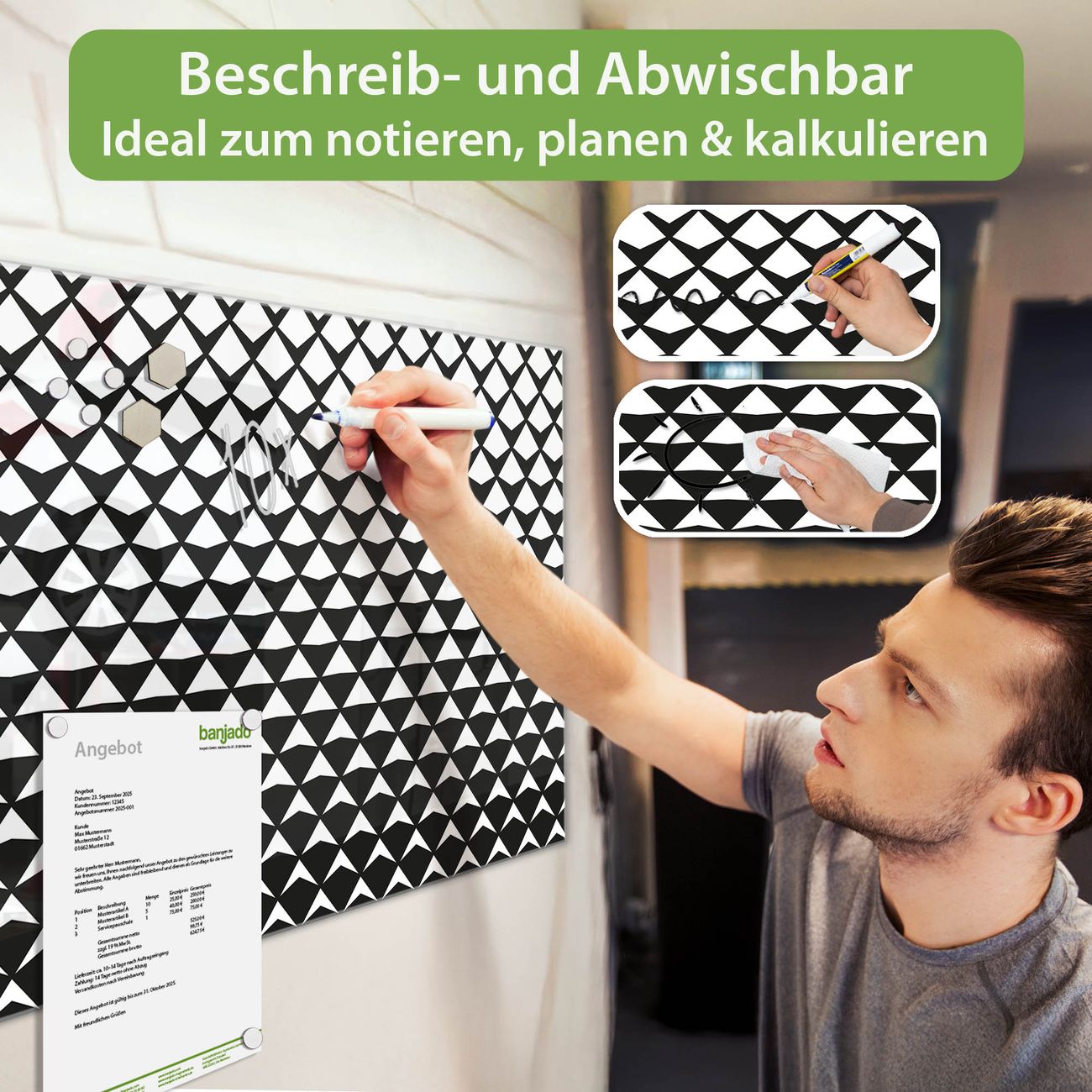Jede Glas Magnettafel wird in unserer Werkstatt von Hand gefertigt und sorgfältig geprüft. So erhalten Sie ein echtes Qualitätsprodukt, das Funktion und Ästhetik perfekt vereint.?? Warum banjado?