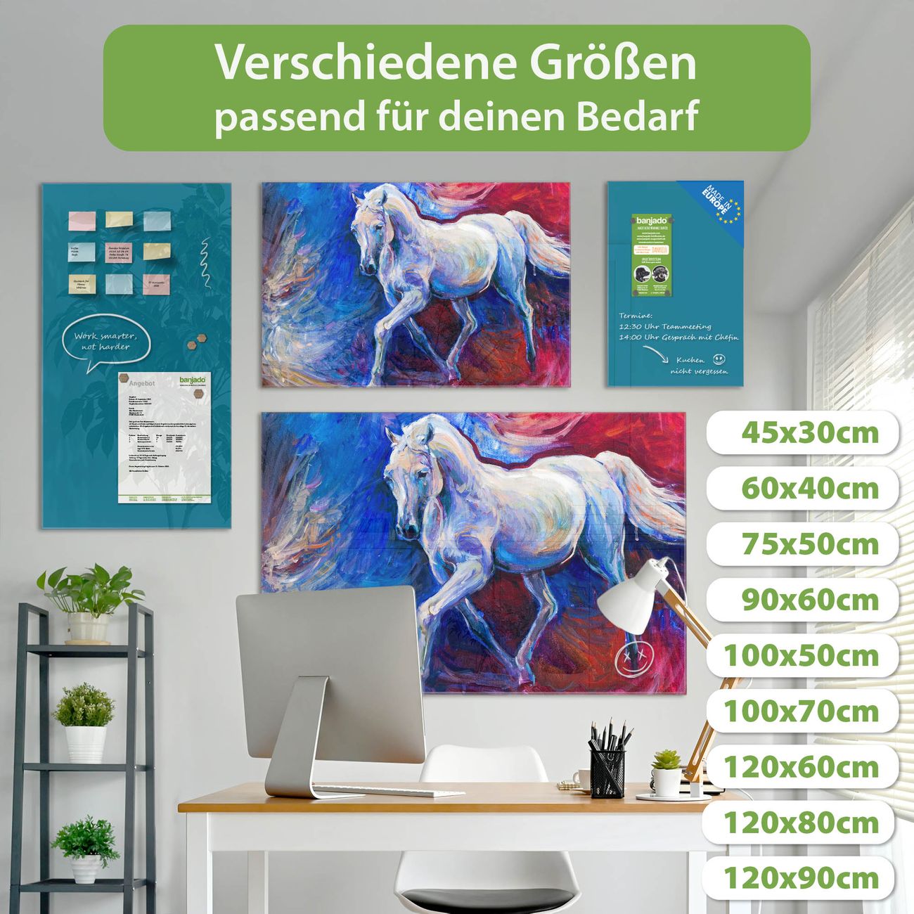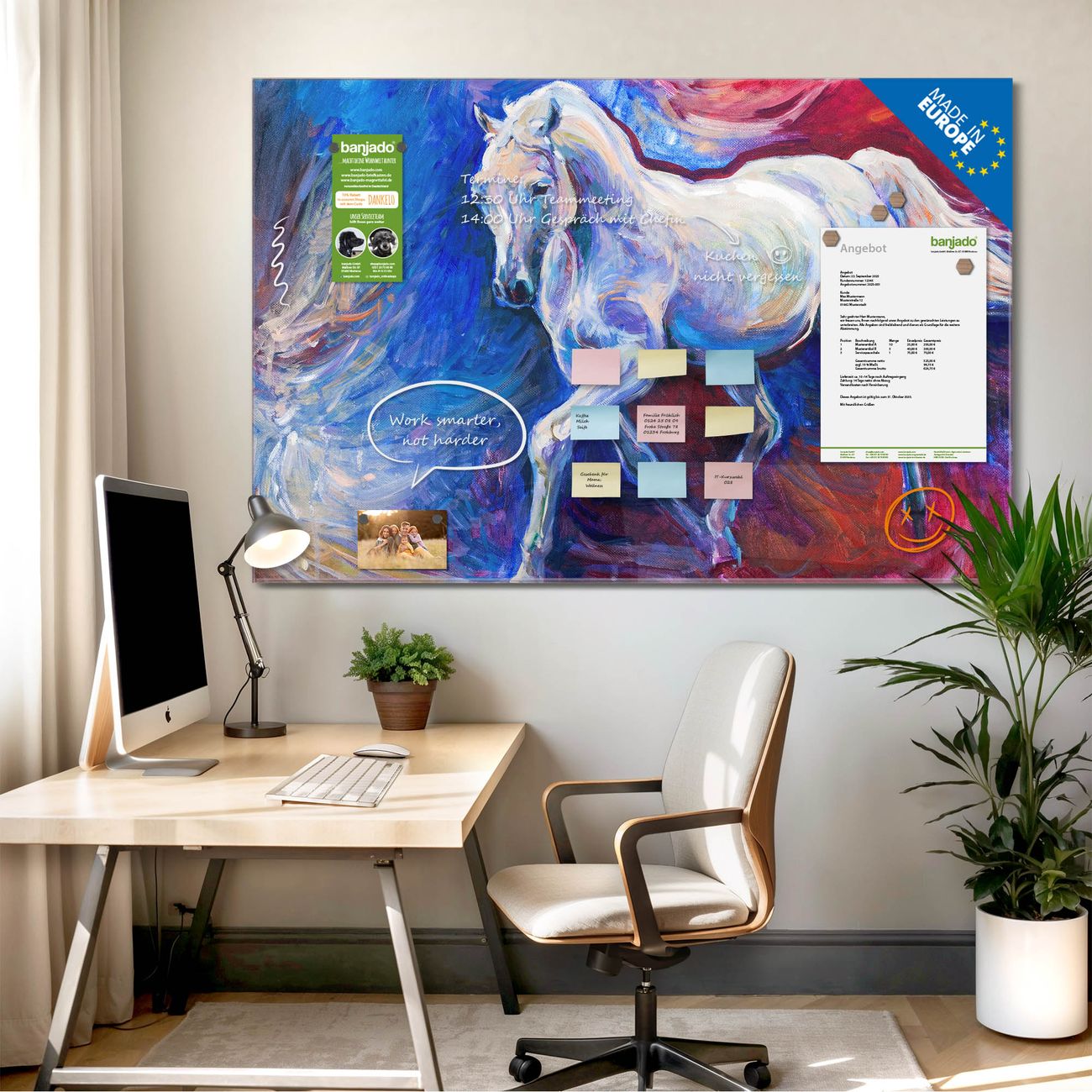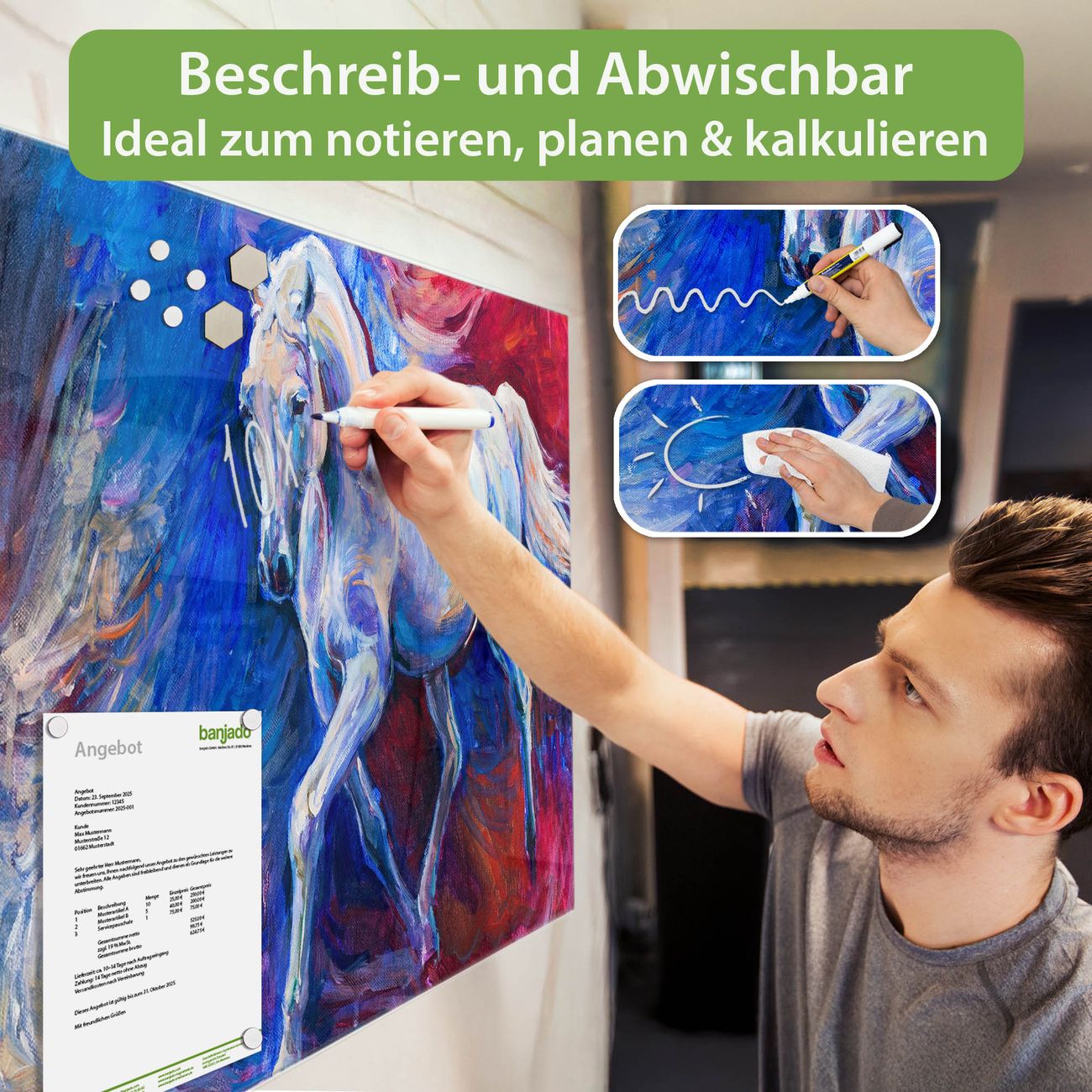 Jede Glas Magnettafel wird in unserer Werkstatt von Hand gefertigt und sorgfältig geprüft. So erhalten Sie ein echtes Qualitätsprodukt, das Funktion und Ästhetik perfekt vereint.?? Warum banjado?