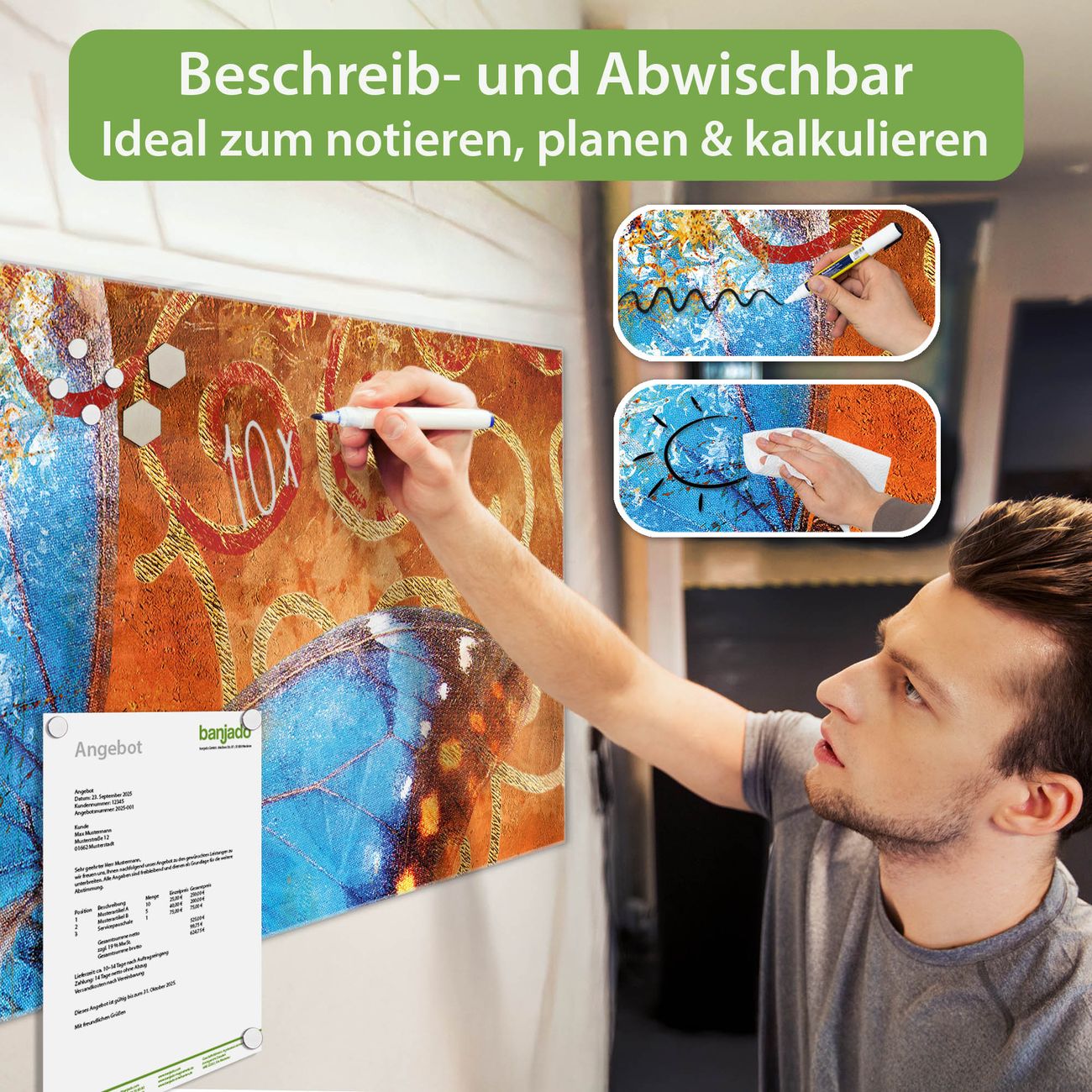 Die banjado Glas Magnettafel mit dem Motiv Motiv Schmetterling verbindet Funktionalität mit Stil. Sie ersetzt das Zettelchaos durch klare Strukturen und bringt dabei eine warme, natürliche Atmosphäre in Ihr Zuhause. Ob im Büro, in der Küche oder im Eingangsbereich - dieses Design-Board zieht Blicke an und sorgt für Ordnung mit Charakter.