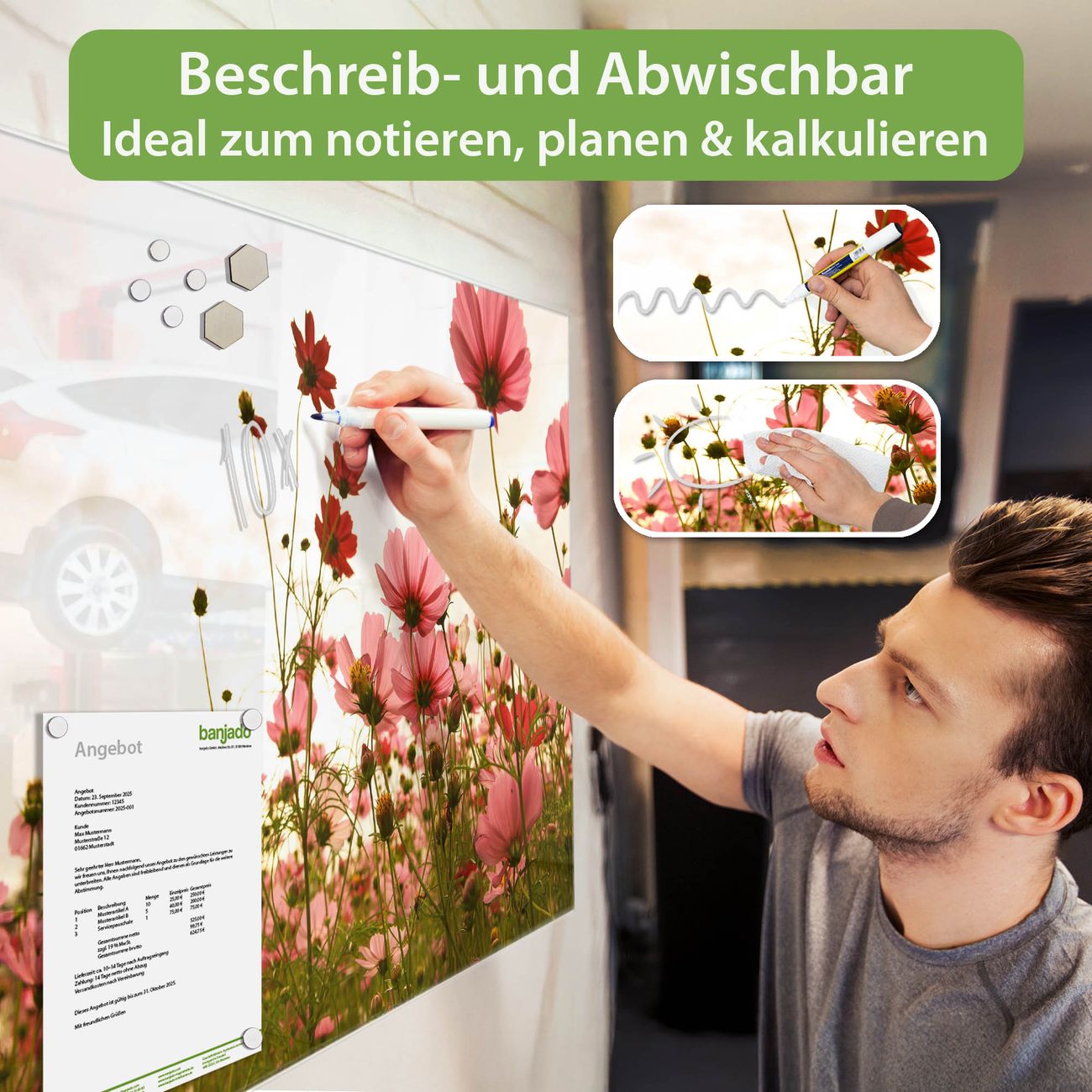 Bitte beachten Sie, dass ausschliessliche spezielle Magnete an der Glastafel haften. Wir empfehlen banjado Neodym Magnete, diese sind durch uns auf Wirksamkeit geprüft.