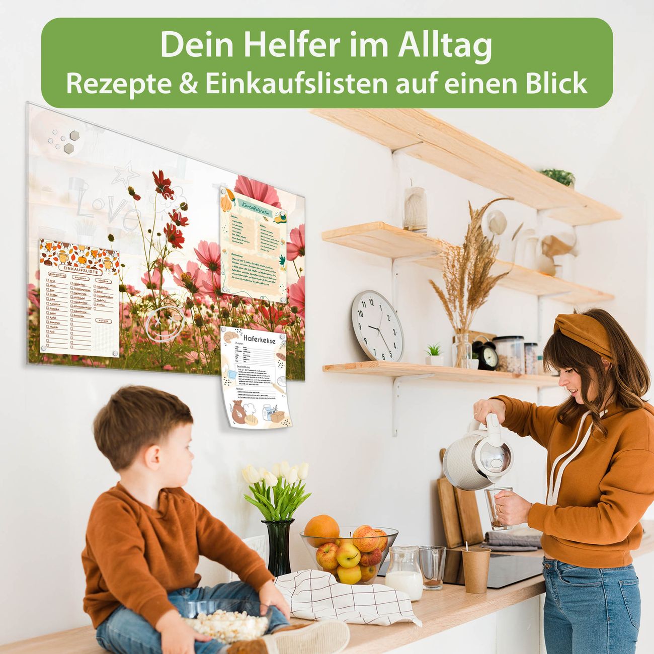 Auf der glatten Glasoberfläche lassen sich Termine, Rezepte oder Notizen ganz einfach mit Kreidestiften festhalten und rückstandslos entfernen. Starke Neodym-Magnete halten Ihre wichtigsten Erinnerungen sicher an Ort und Stelle. So entsteht Ihre ganz persönliche Ideenwand - jeden Tag neu.