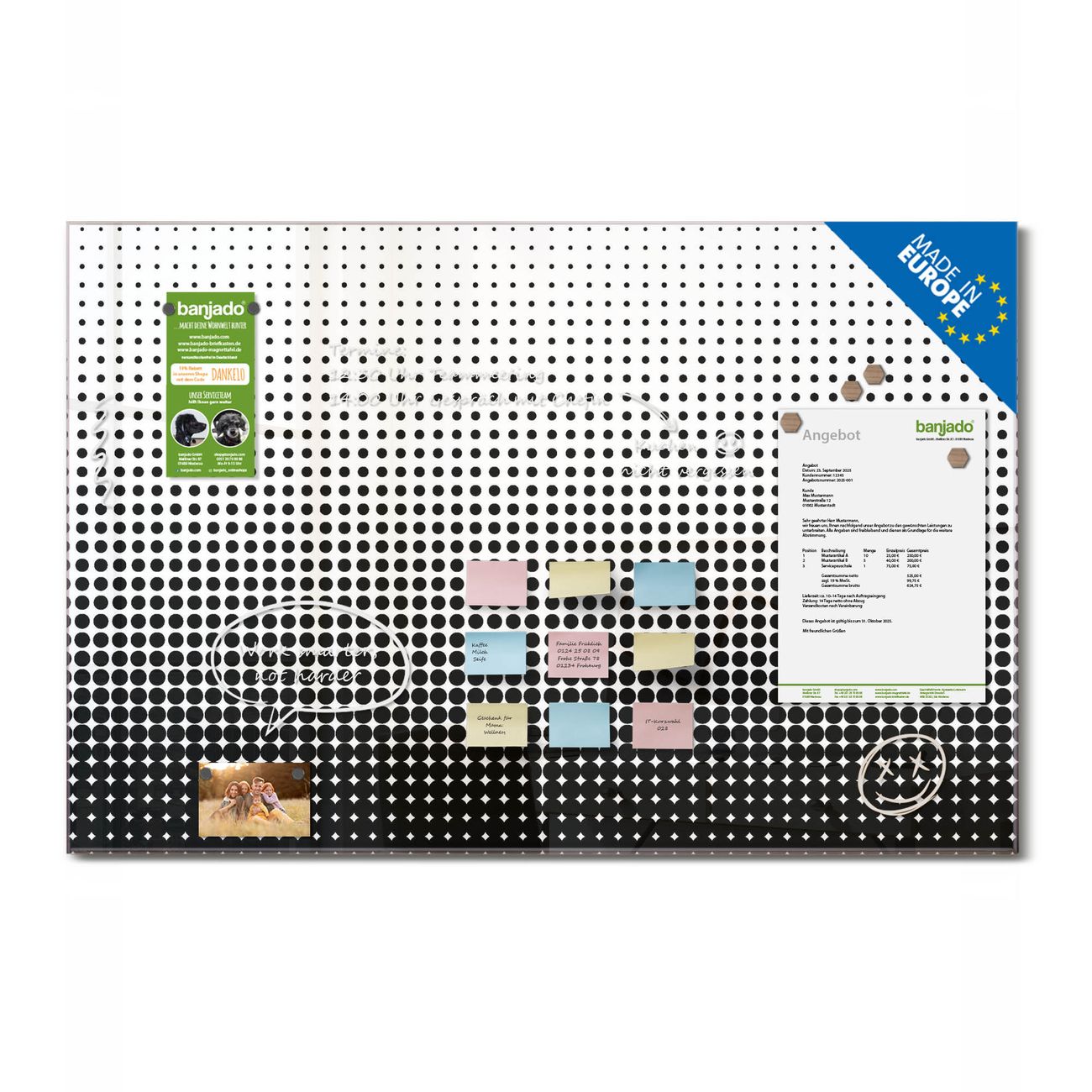 Jede Glas Magnettafel wird in unserer Werkstatt von Hand gefertigt und sorgfältig geprüft. So erhalten Sie ein echtes Qualitätsprodukt, das Funktion und Ästhetik perfekt vereint.?? Warum banjado?