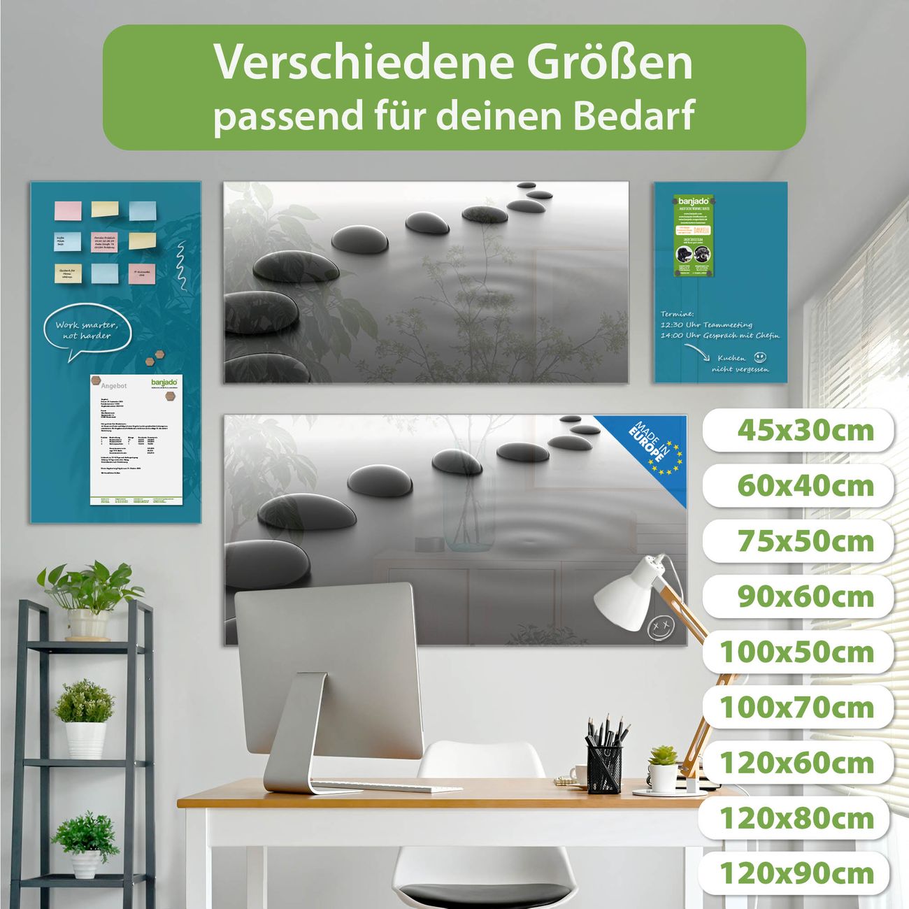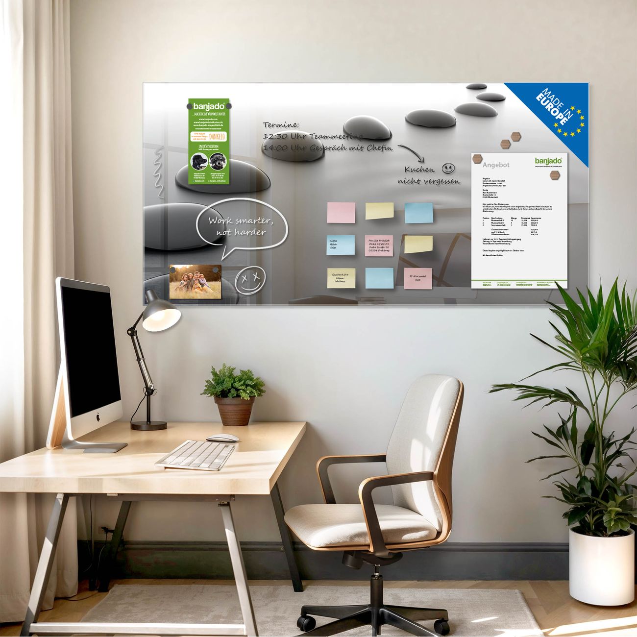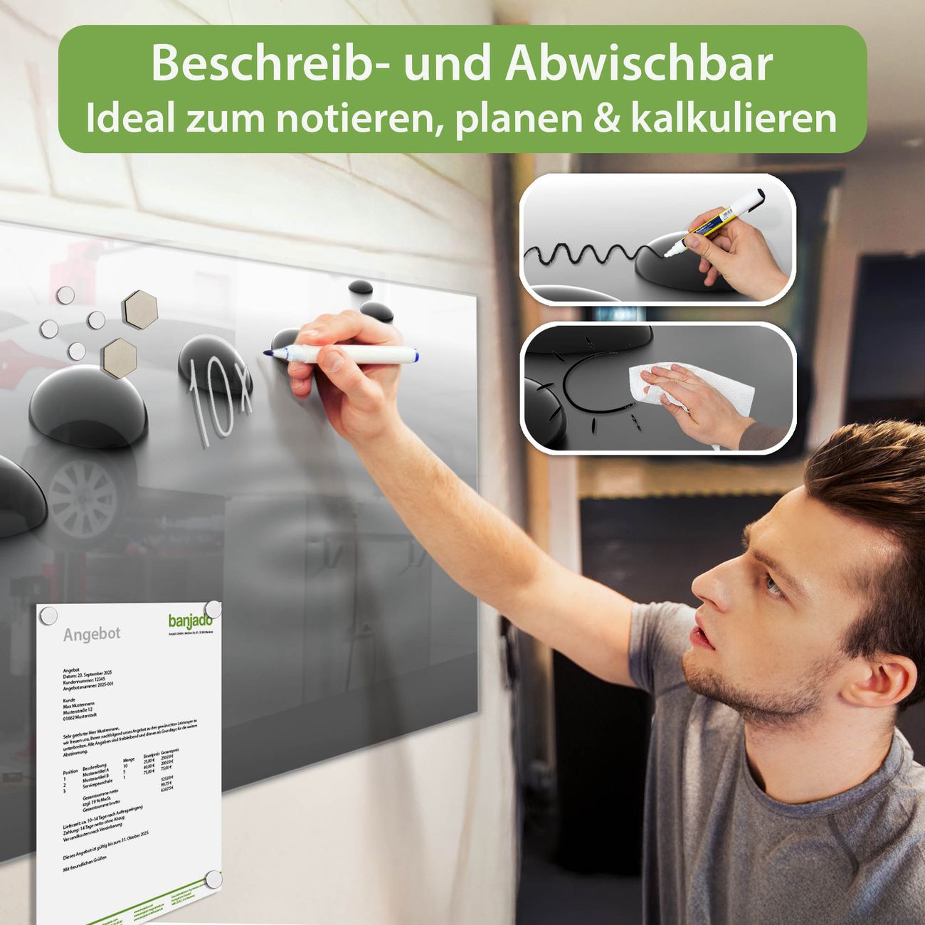 Jede Glas Magnettafel wird in unserer Werkstatt von Hand gefertigt und sorgfältig geprüft. So erhalten Sie ein echtes Qualitätsprodukt, das Funktion und Ästhetik perfekt vereint.?? Warum banjado?