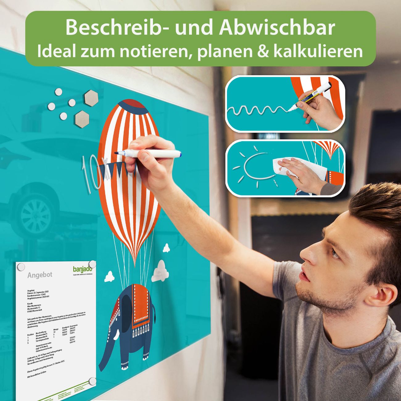 Jede Glas Magnettafel wird in unserer Werkstatt von Hand gefertigt und sorgfältig geprüft. So erhalten Sie ein echtes Qualitätsprodukt, das Funktion und Ästhetik perfekt vereint.?? Warum banjado?