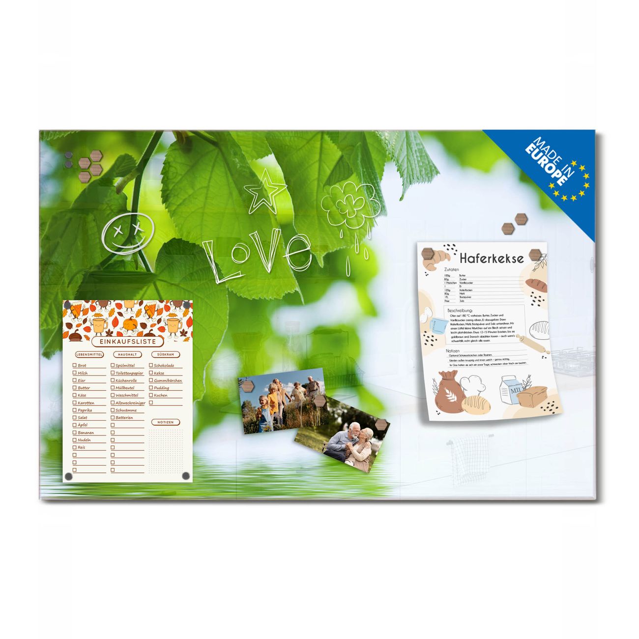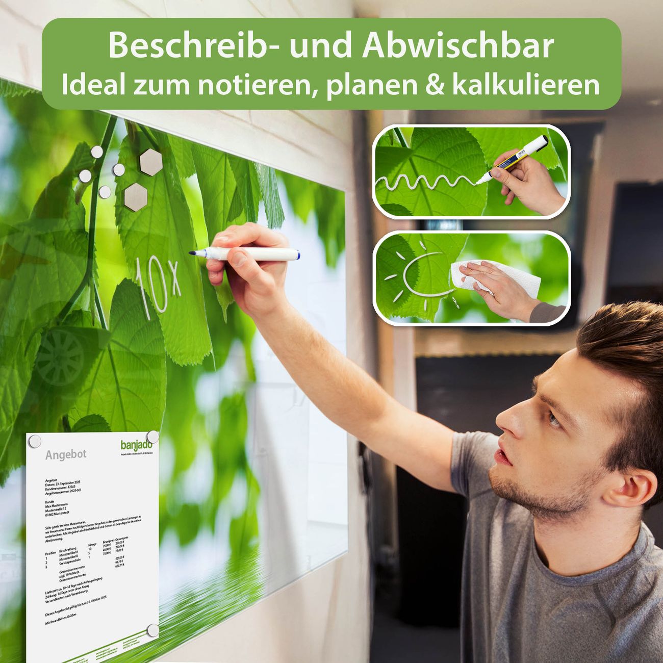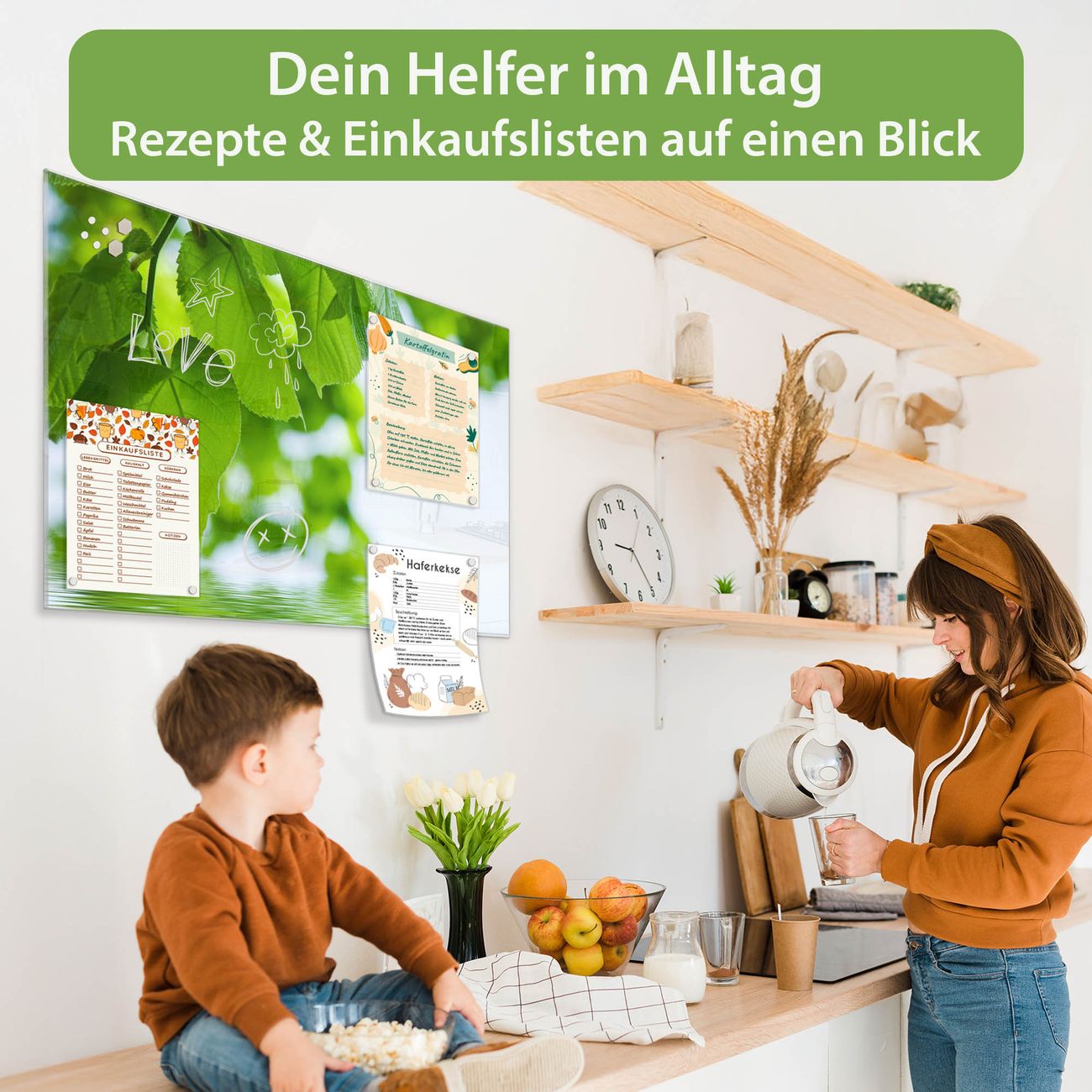 Auf der glatten Glasoberfläche lassen sich Termine, Rezepte oder Notizen ganz einfach mit Kreidestiften festhalten und rückstandslos entfernen. Starke Neodym-Magnete halten Ihre wichtigsten Erinnerungen sicher an Ort und Stelle. So entsteht Ihre ganz persönliche Ideenwand - jeden Tag neu.