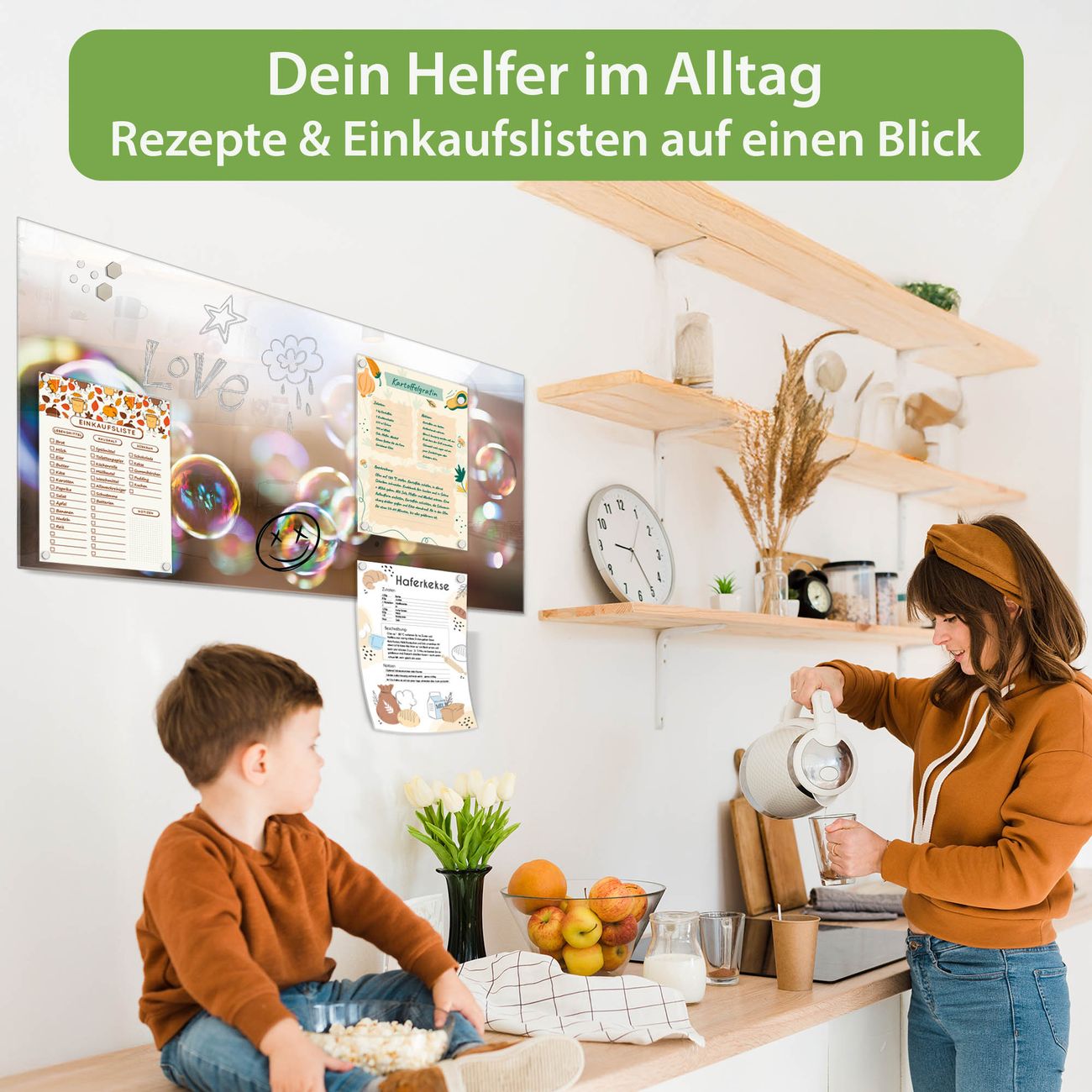 Ein Stück Design, das Ihren Alltag organisiert. Schreiben, heften, inspirieren - alles an einem Ort. Qualität, die man spürt. Montage leicht gemacht. Handwerk mit Herz - veredelt in Sachsen. Einzigartiges Design mit Motiv Motiv Seifenblasen Beschreibbare Glasoberfläche, leicht zu reinigen Starke Magnetkraft durch Stahlrückwand Inklusive 4 Neodym-Magneten Flexible Montageoptionen Handveredelt in Sachsen - Qualität, die bleibt