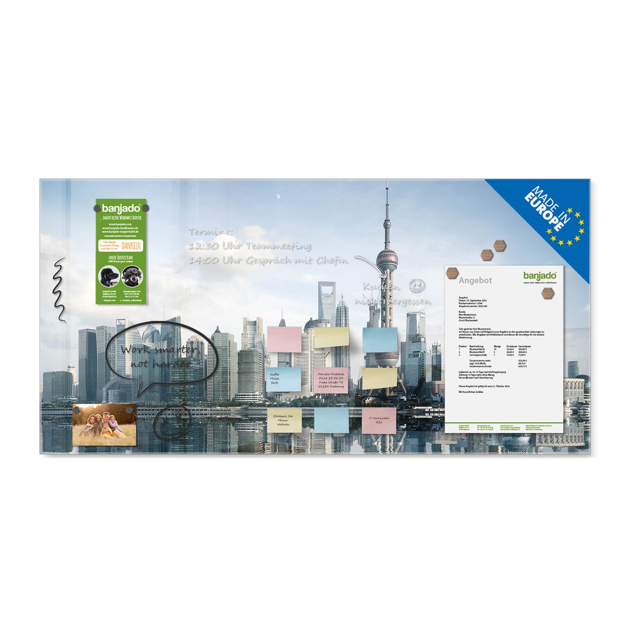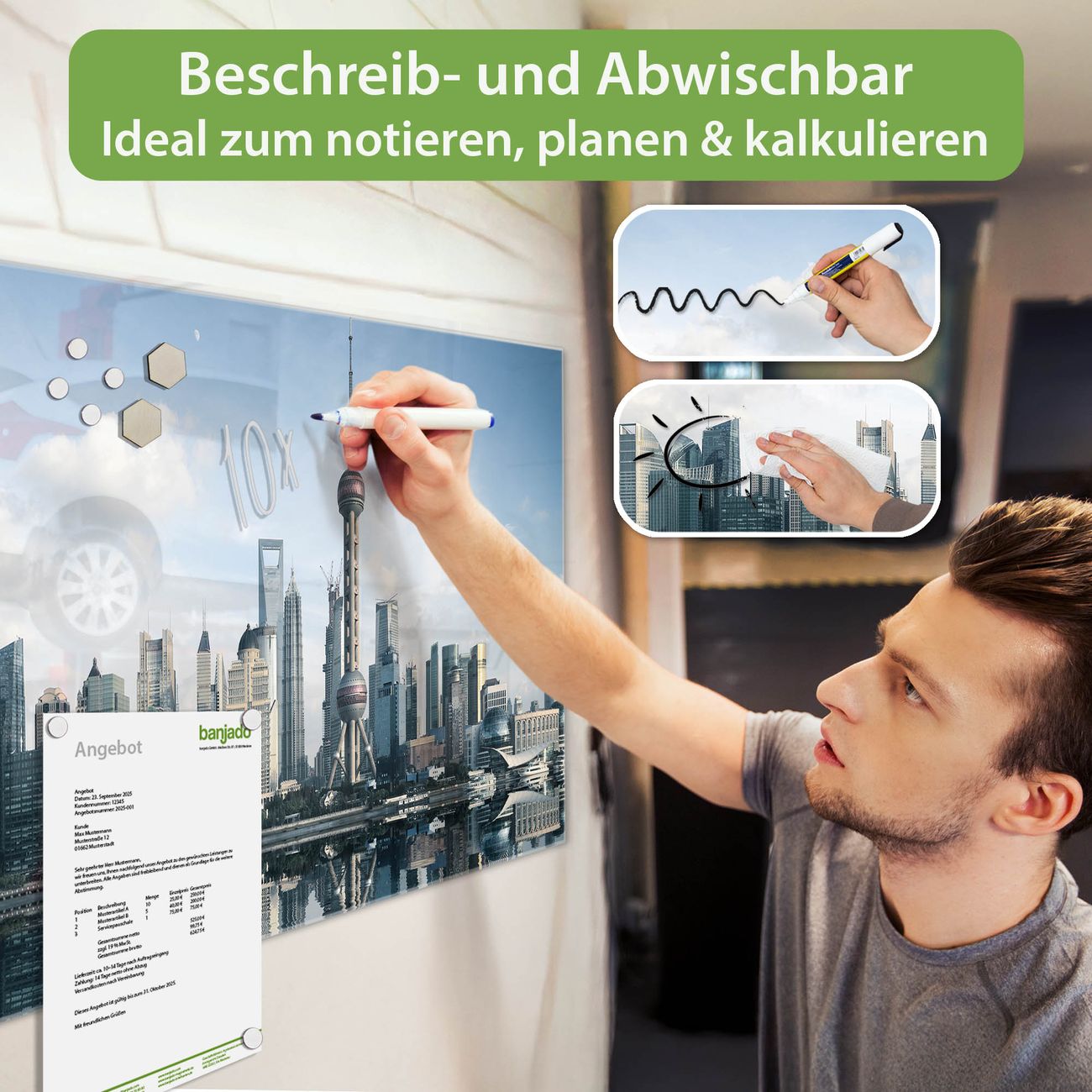 Jede Glas Magnettafel wird in unserer Werkstatt von Hand gefertigt und sorgfältig geprüft. So erhalten Sie ein echtes Qualitätsprodukt, das Funktion und Ästhetik perfekt vereint.?? Warum banjado?