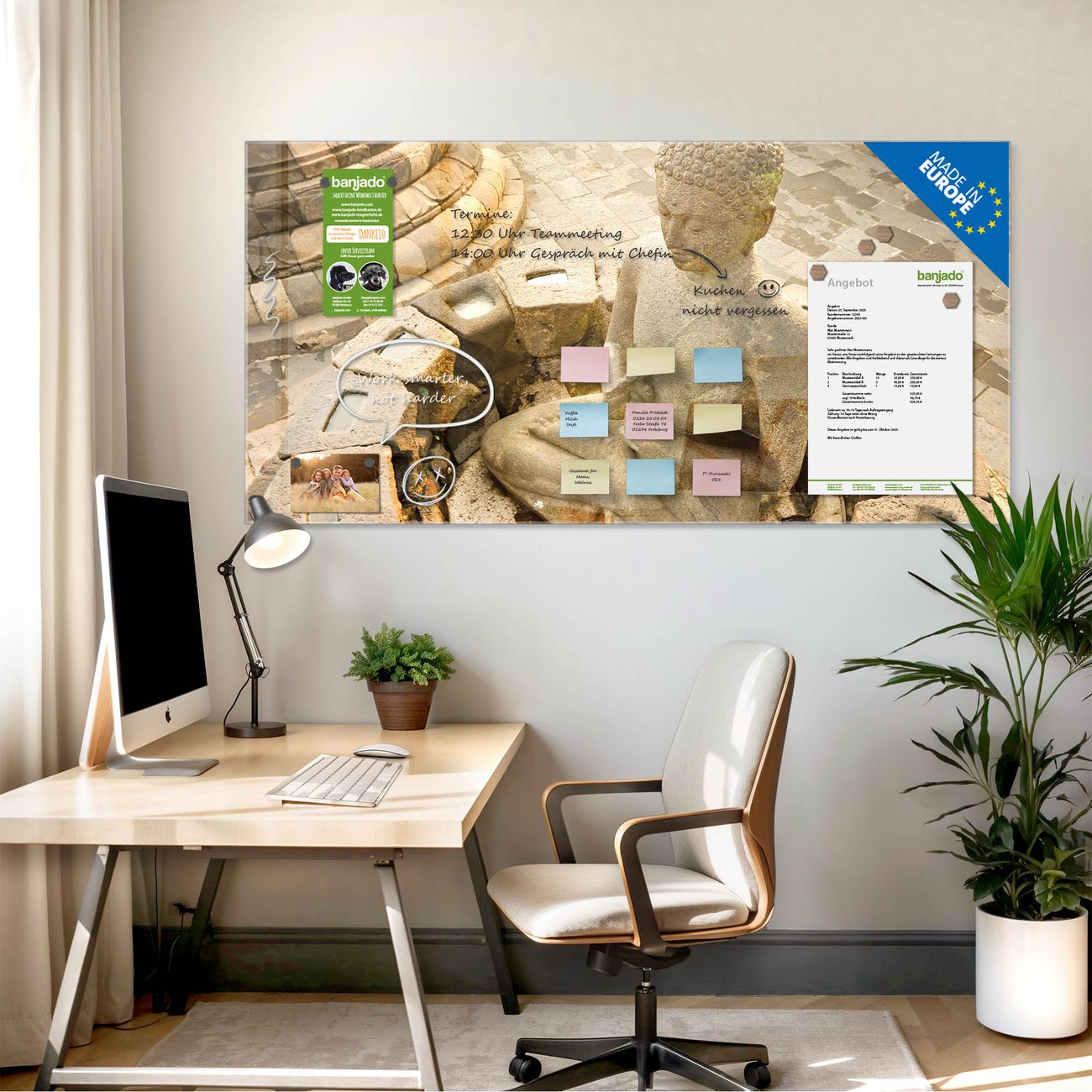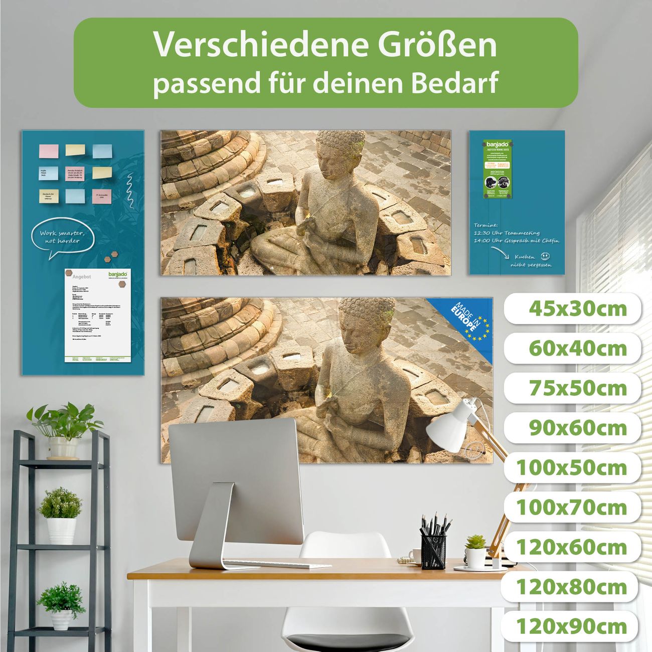 Ein Stück Design, das Ihren Alltag organisiert. Schreiben, heften, inspirieren - alles an einem Ort. Qualität, die man spürt. Montage leicht gemacht. Handwerk mit Herz - veredelt in Sachsen. Einzigartiges Design mit Motiv Motiv Sitzender Buddha Beschreibbare Glasoberfläche, leicht zu reinigen Starke Magnetkraft durch Stahlrückwand Inklusive 4 Neodym-Magneten Flexible Montageoptionen Handveredelt in Sachsen - Qualität, die bleibt