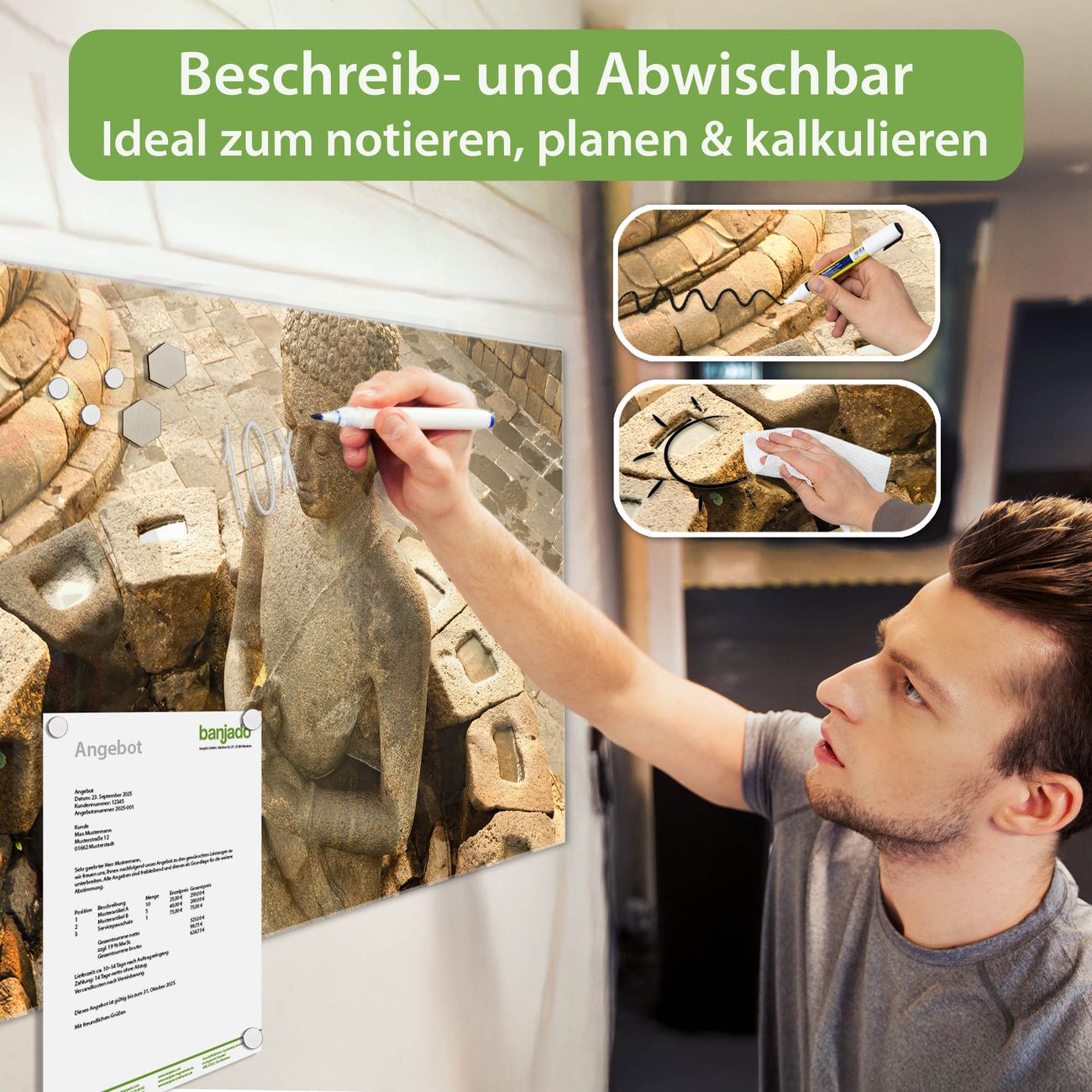 Jede Glas Magnettafel wird in unserer Werkstatt von Hand gefertigt und sorgfältig geprüft. So erhalten Sie ein echtes Qualitätsprodukt, das Funktion und Ästhetik perfekt vereint.?? Warum banjado?