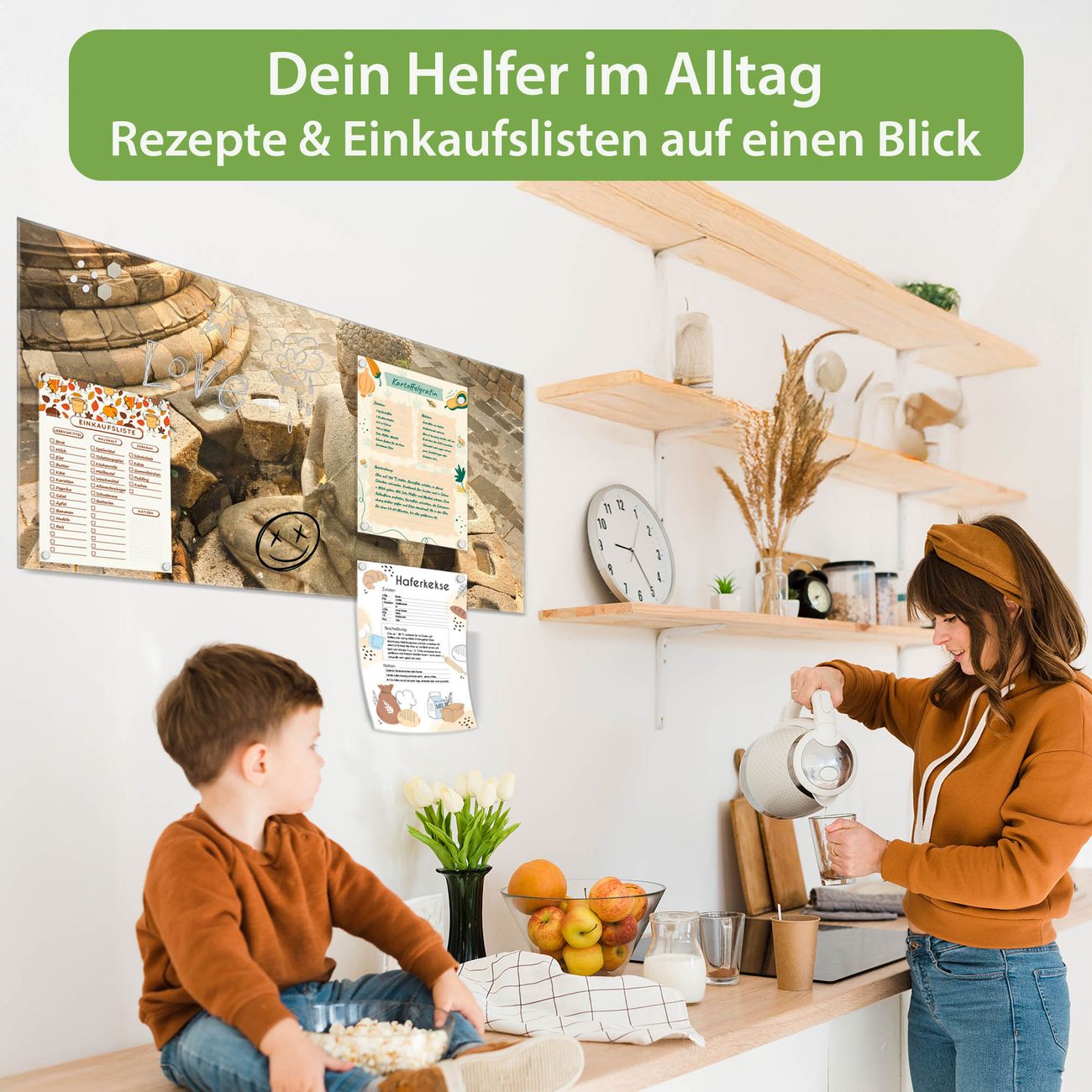 Auf der glatten Glasoberfläche lassen sich Termine, Rezepte oder Notizen ganz einfach mit Kreidestiften festhalten und rückstandslos entfernen. Starke Neodym-Magnete halten Ihre wichtigsten Erinnerungen sicher an Ort und Stelle. So entsteht Ihre ganz persönliche Ideenwand - jeden Tag neu.
