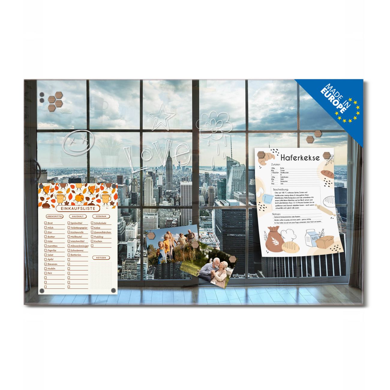 Auf der glatten Glasoberfläche lassen sich Termine, Rezepte oder Notizen ganz einfach mit Kreidestiften festhalten und rückstandslos entfernen. Starke Neodym-Magnete halten Ihre wichtigsten Erinnerungen sicher an Ort und Stelle. So entsteht Ihre ganz persönliche Ideenwand - jeden Tag neu.