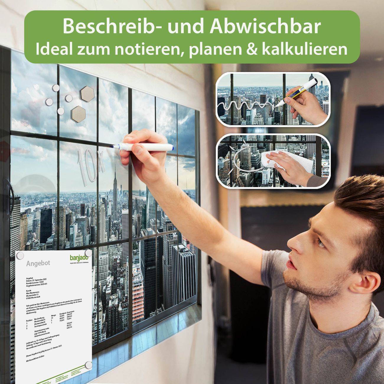 Jede Glas Magnettafel wird in unserer Werkstatt von Hand gefertigt und sorgfältig geprüft. So erhalten Sie ein echtes Qualitätsprodukt, das Funktion und Ästhetik perfekt vereint.?? Warum banjado?