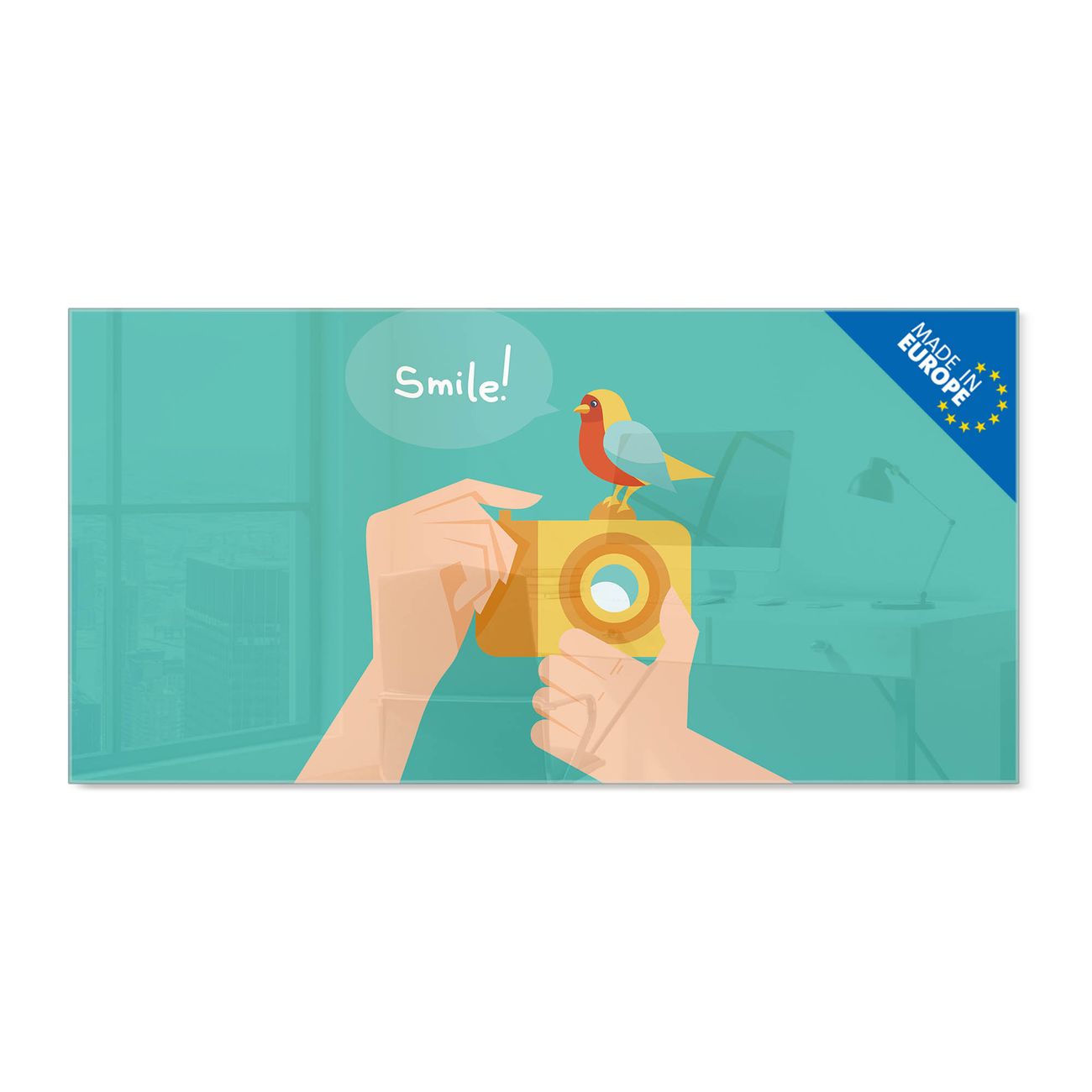 Glas Magnettafel im Querformat Motiv Bitte Lächeln 2