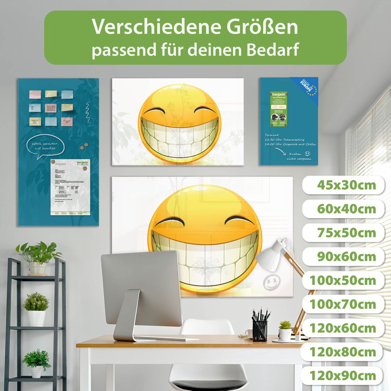 Die banjado Glas Magnettafel mit dem Motiv Motiv Smile verbindet Funktionalität mit Stil. Sie ersetzt das Zettelchaos durch klare Strukturen und bringt dabei eine warme, natürliche Atmosphäre in Ihr Zuhause. Ob im Büro, in der Küche oder im Eingangsbereich - dieses Design-Board zieht Blicke an und sorgt für Ordnung mit Charakter.
