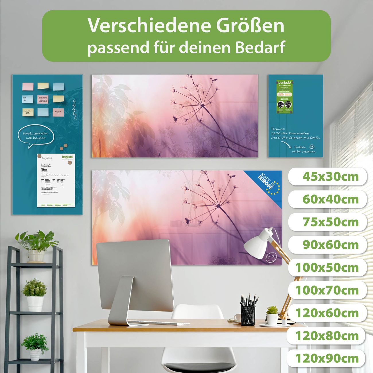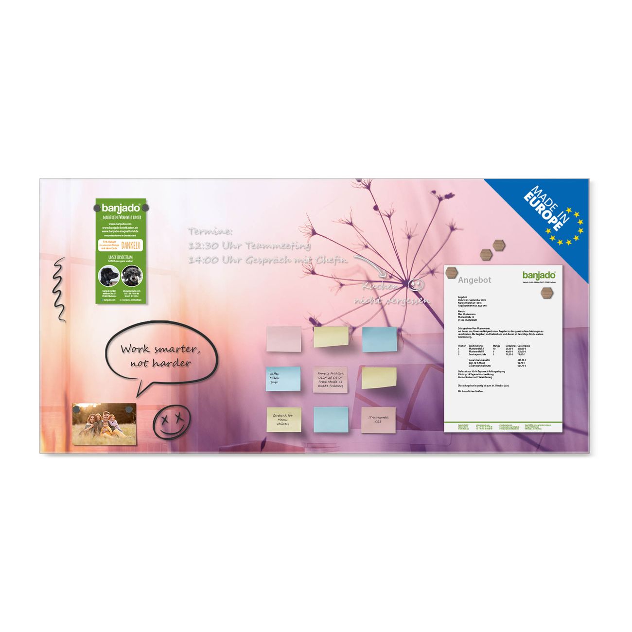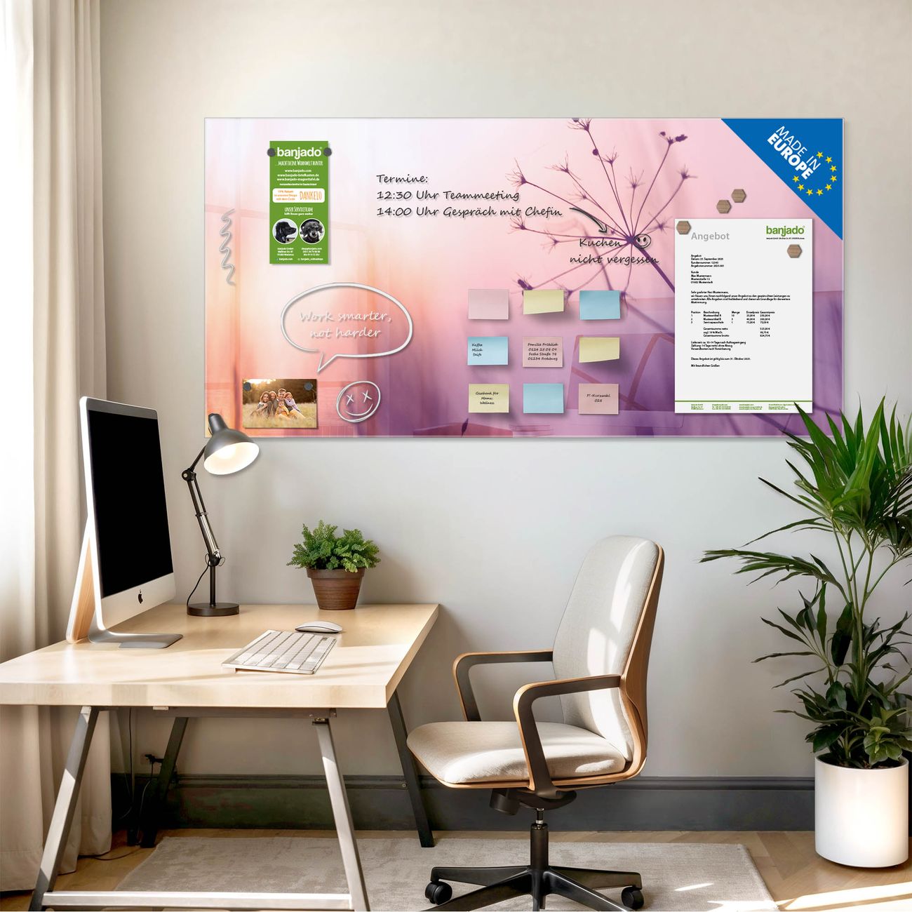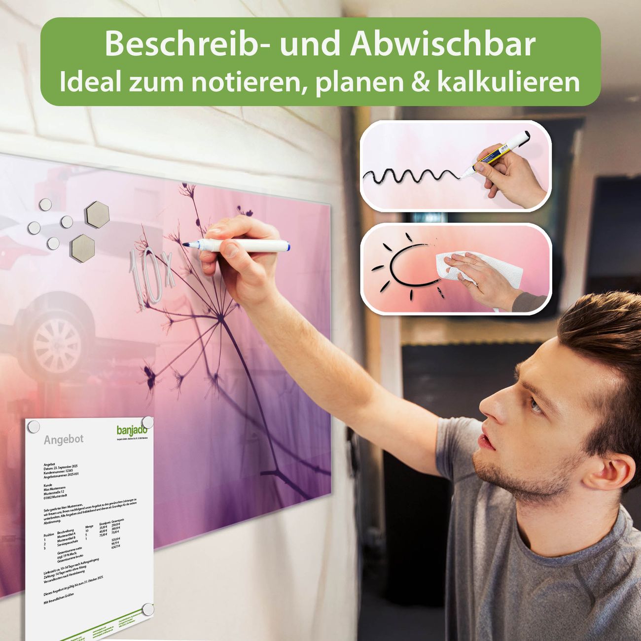 Jede Glas Magnettafel wird in unserer Werkstatt von Hand gefertigt und sorgfältig geprüft. So erhalten Sie ein echtes Qualitätsprodukt, das Funktion und Ästhetik perfekt vereint.?? Warum banjado?