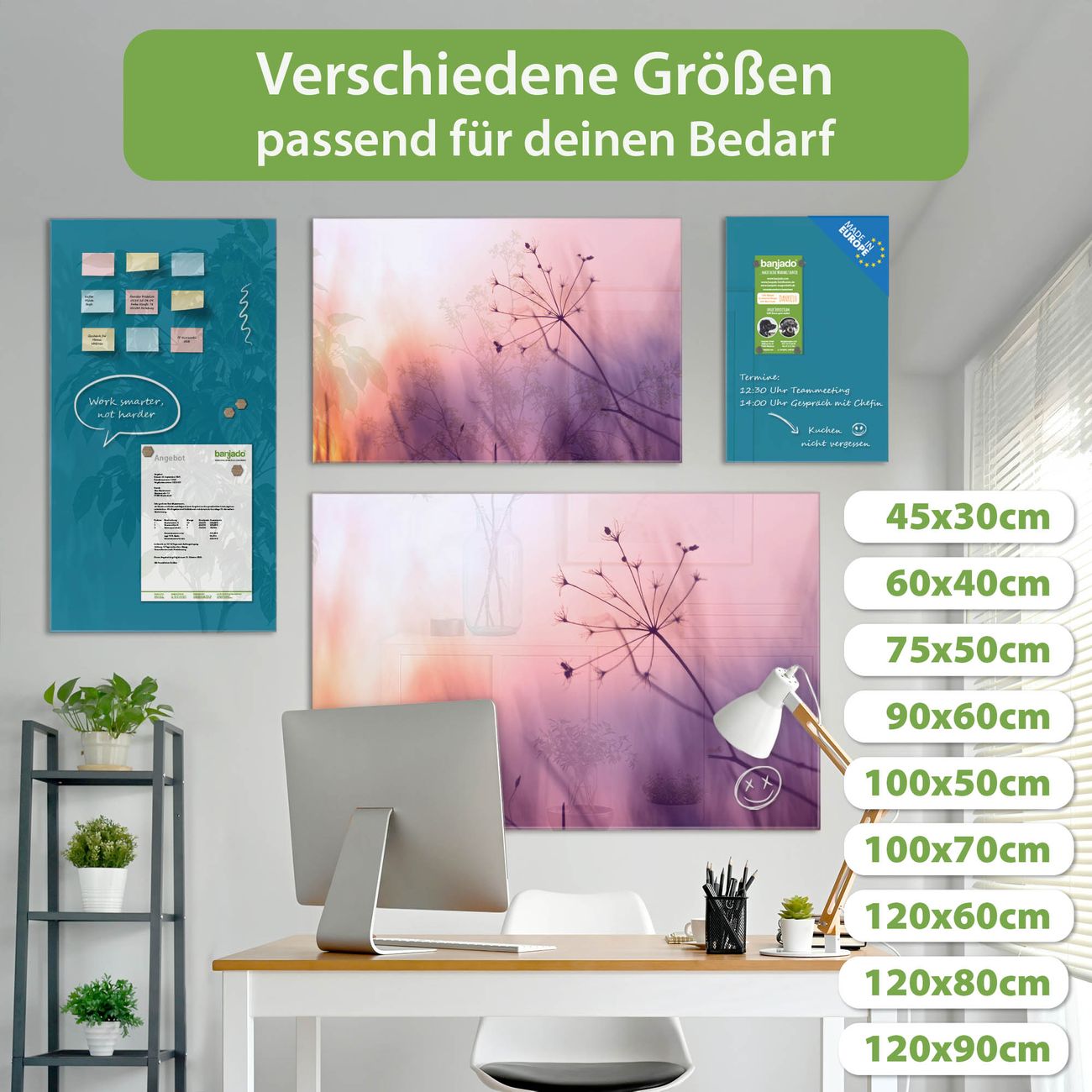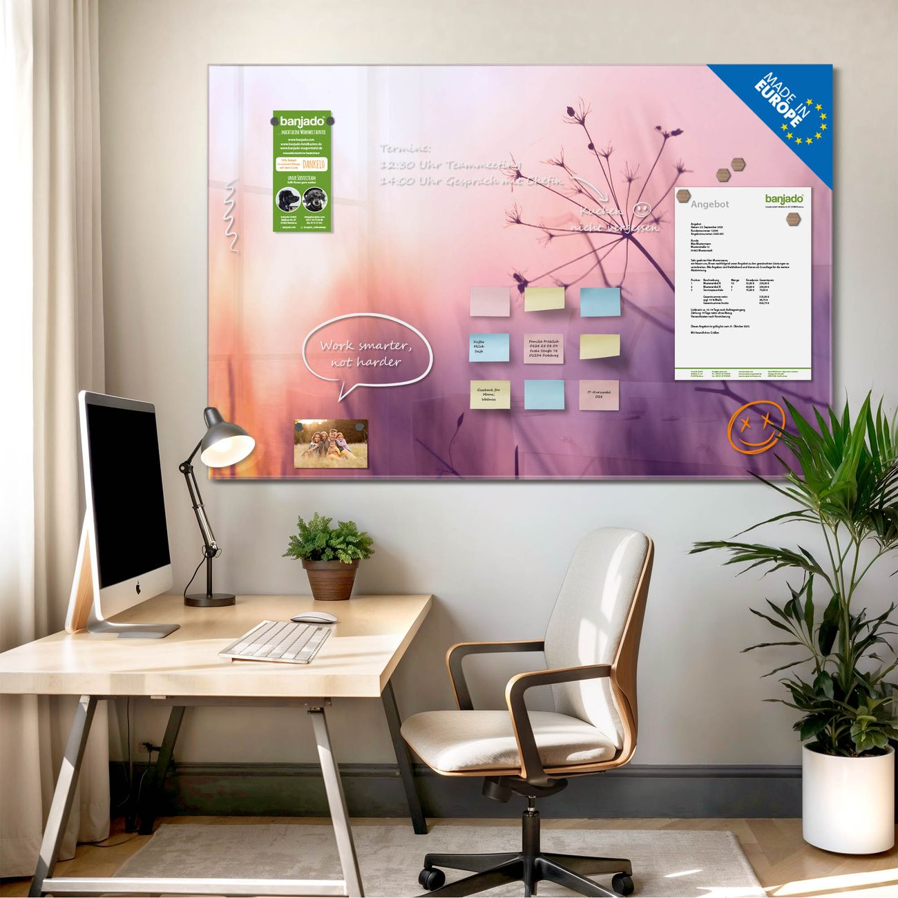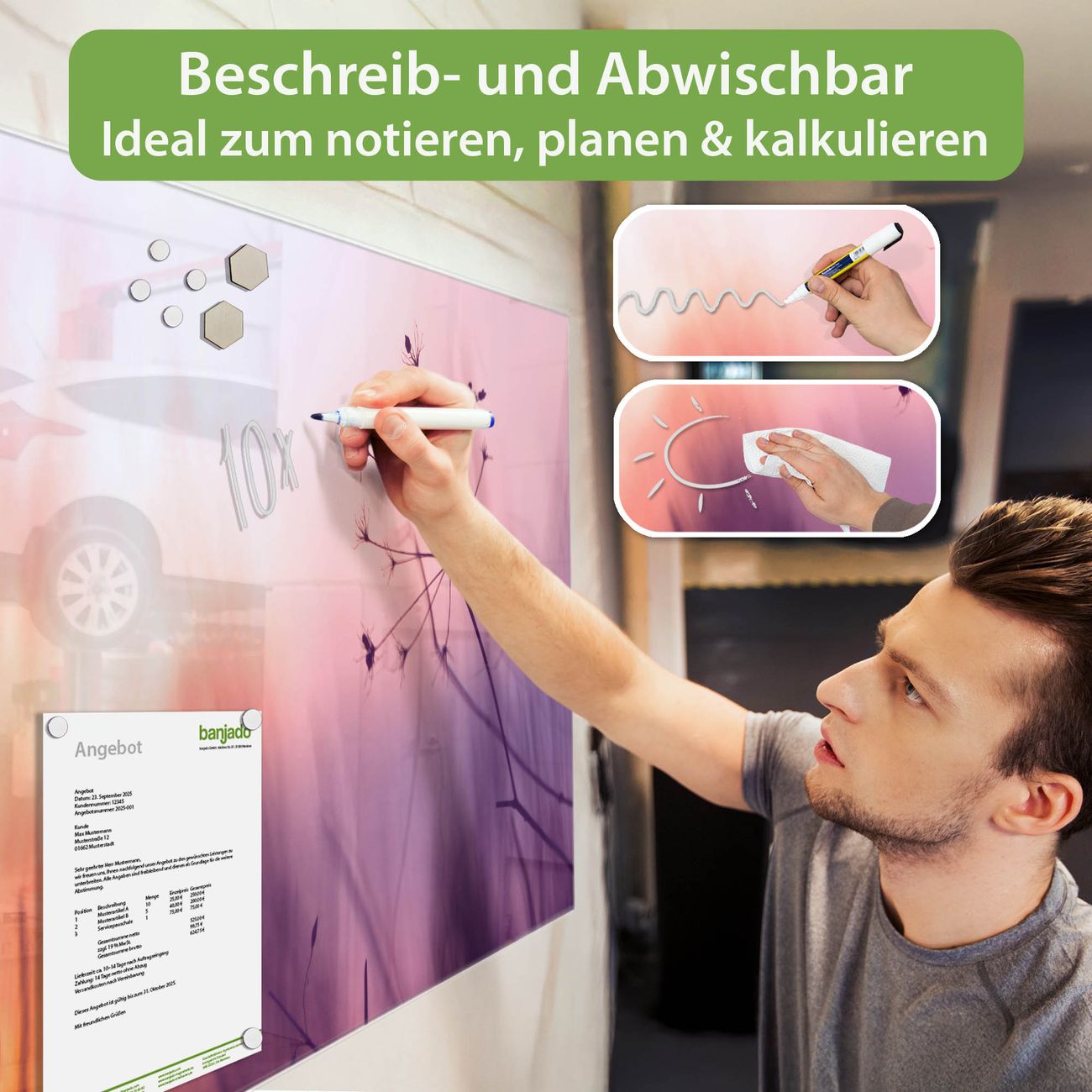 Jede Glas Magnettafel wird in unserer Werkstatt von Hand gefertigt und sorgfältig geprüft. So erhalten Sie ein echtes Qualitätsprodukt, das Funktion und Ästhetik perfekt vereint.?? Warum banjado?