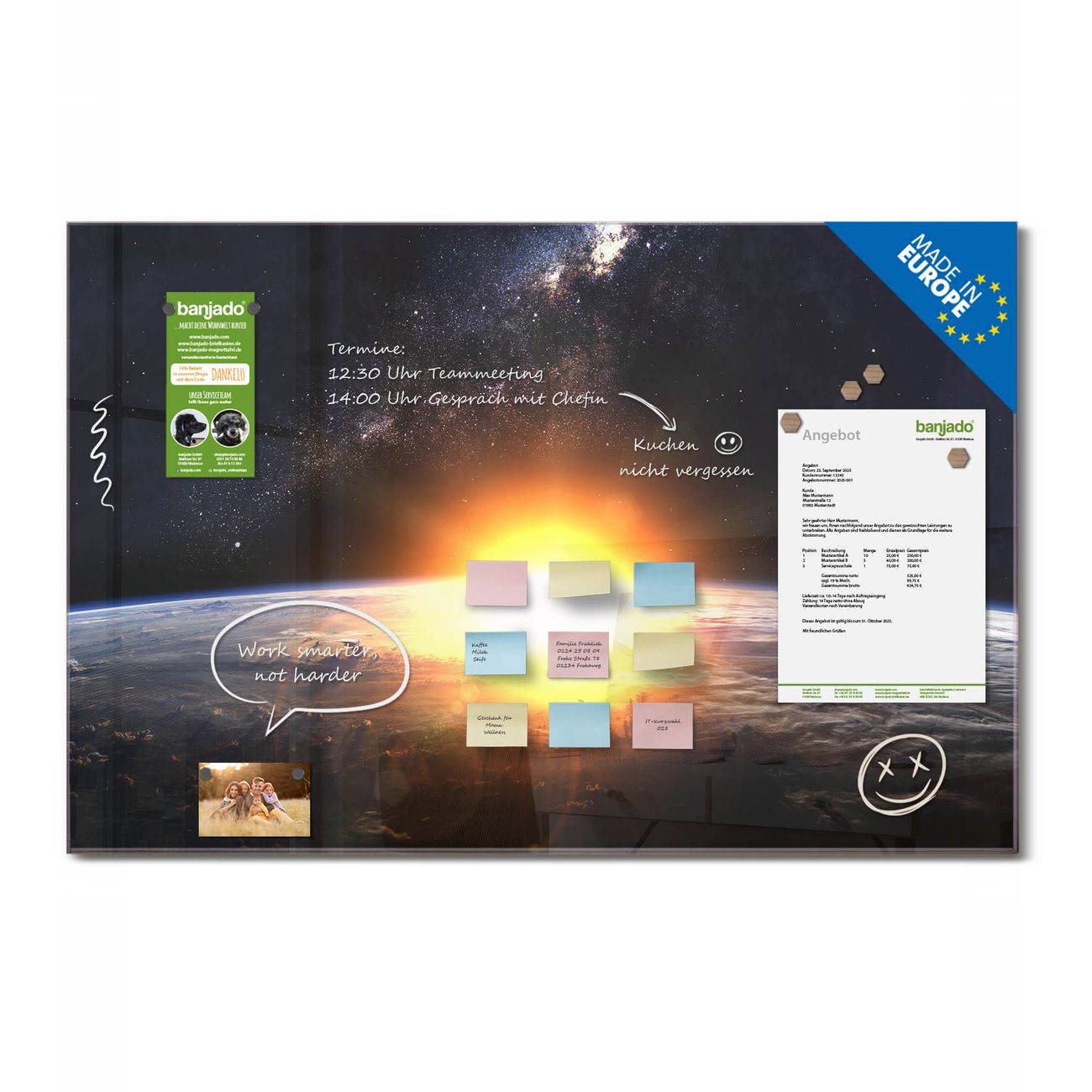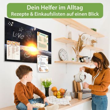 Ein Stück Design, das Ihren Alltag organisiert. Schreiben, heften, inspirieren - alles an einem Ort. Qualität, die man spürt. Montage leicht gemacht. Handwerk mit Herz - veredelt in Sachsen. Einzigartiges Design mit Motiv Motiv Sonne im Weltall Beschreibbare Glasoberfläche, leicht zu reinigen Starke Magnetkraft durch Stahlrückwand Inklusive 4 Neodym-Magneten Flexible Montageoptionen Handveredelt in Sachsen - Qualität, die bleibt