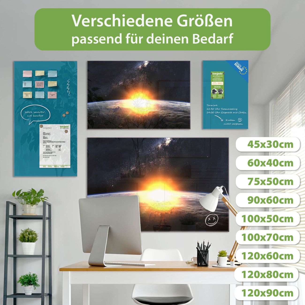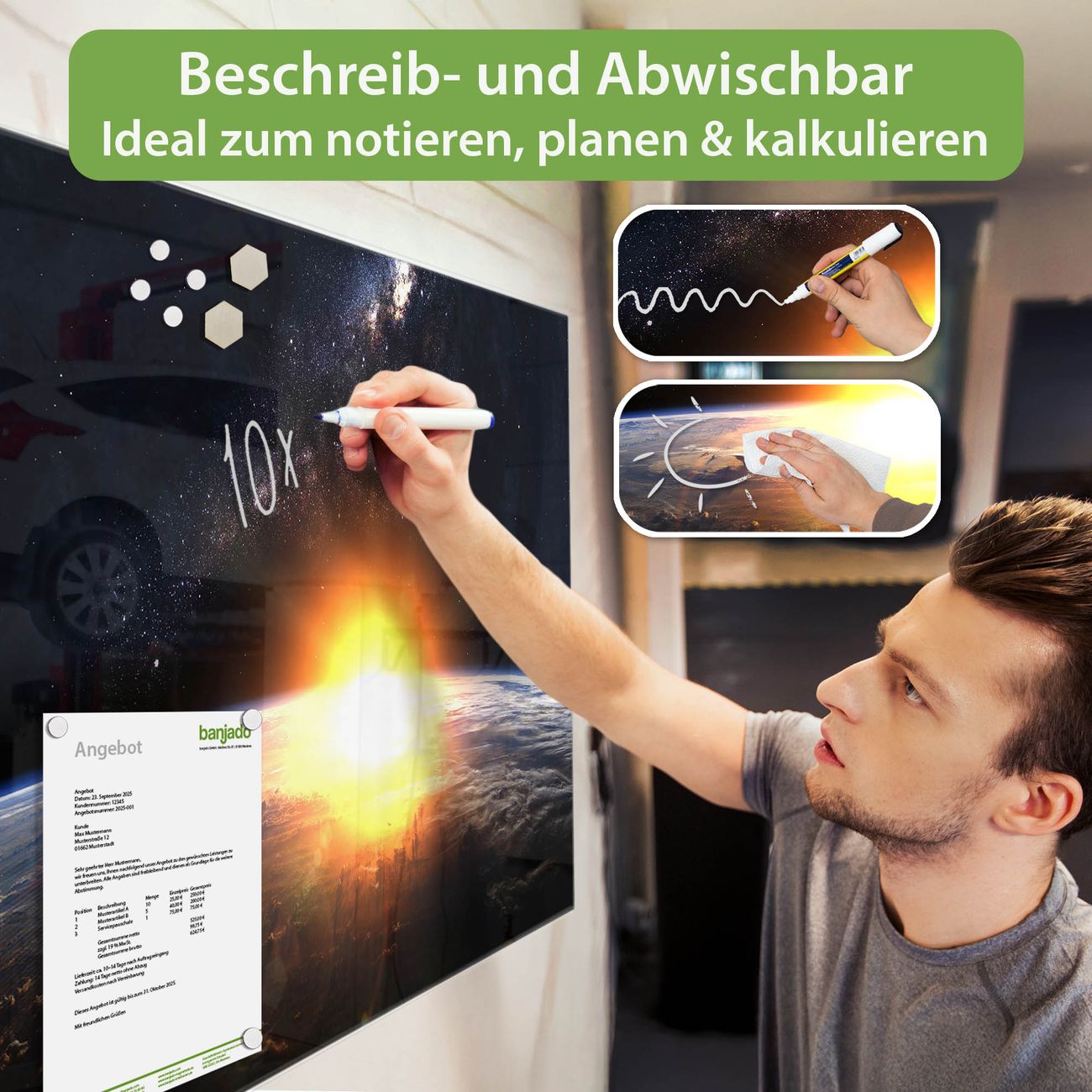 Jede Glas Magnettafel wird in unserer Werkstatt von Hand gefertigt und sorgfältig geprüft. So erhalten Sie ein echtes Qualitätsprodukt, das Funktion und Ästhetik perfekt vereint.?? Warum banjado?