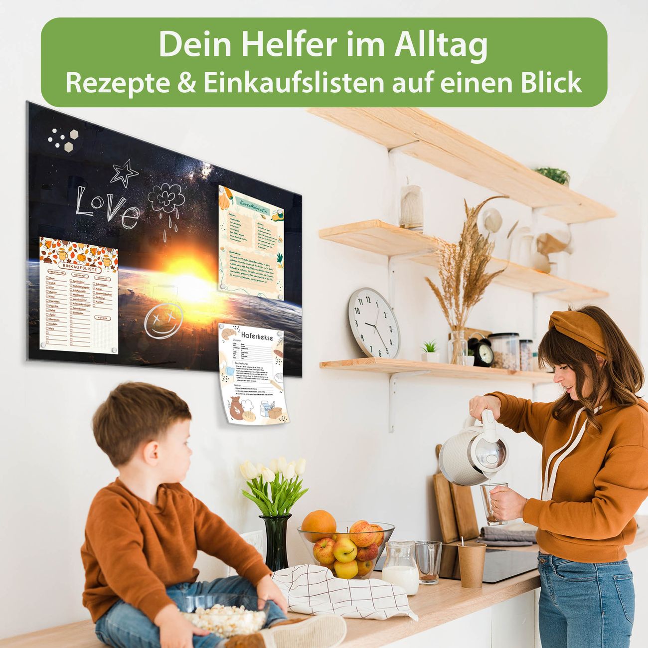 Auf der glatten Glasoberfläche lassen sich Termine, Rezepte oder Notizen ganz einfach mit Kreidestiften festhalten und rückstandslos entfernen. Starke Neodym-Magnete halten Ihre wichtigsten Erinnerungen sicher an Ort und Stelle. So entsteht Ihre ganz persönliche Ideenwand - jeden Tag neu.