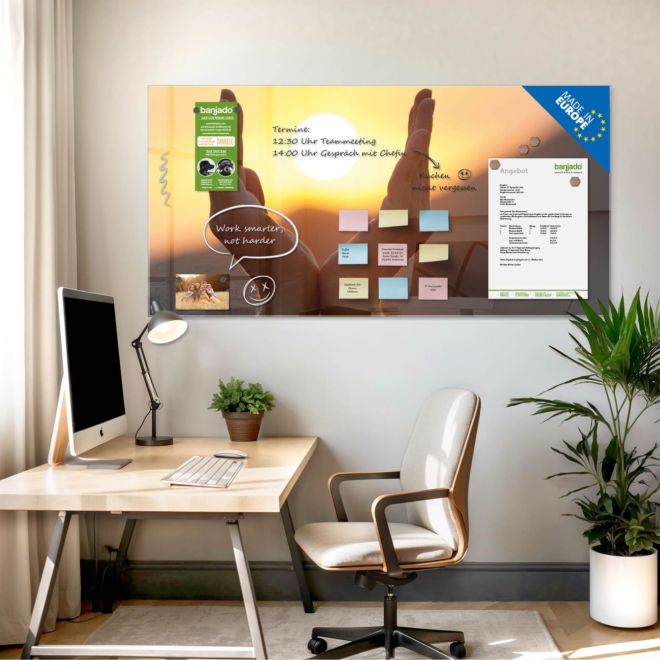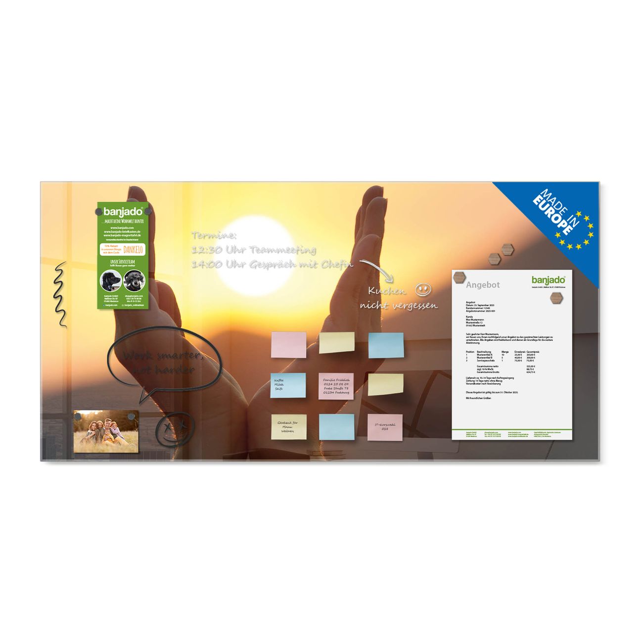 Jede Glas Magnettafel wird in unserer Werkstatt von Hand gefertigt und sorgfältig geprüft. So erhalten Sie ein echtes Qualitätsprodukt, das Funktion und Ästhetik perfekt vereint.?? Warum banjado?