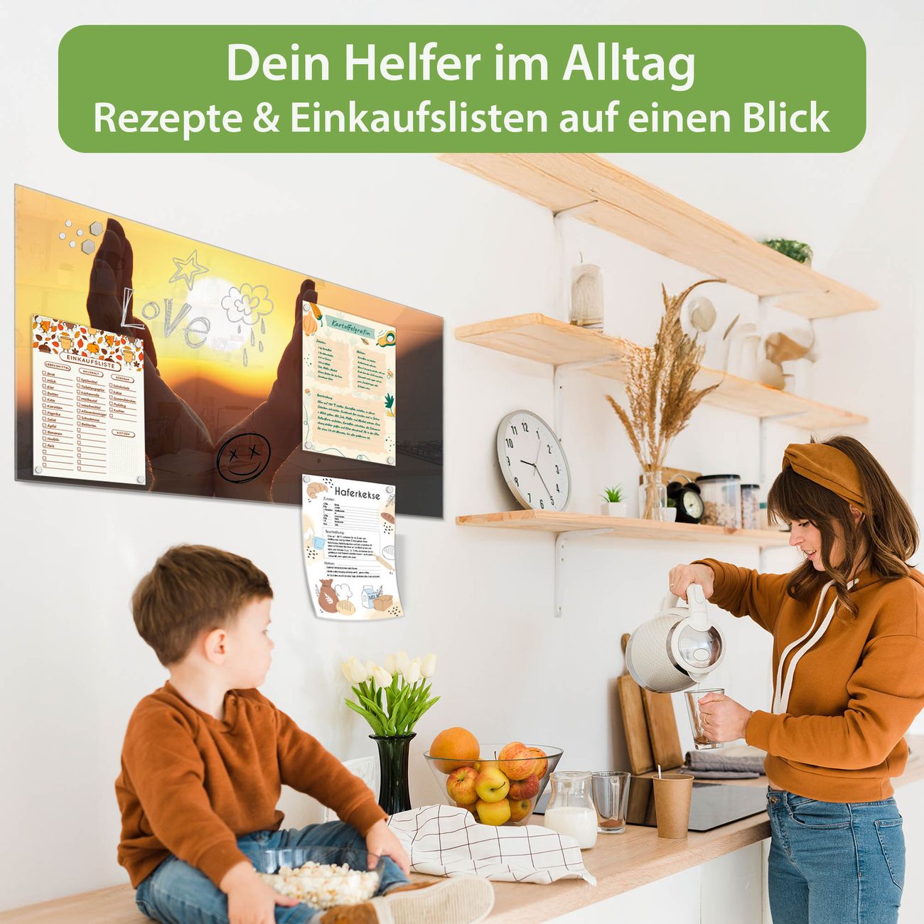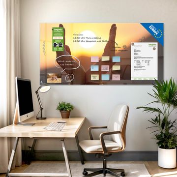 Auf der glatten Glasoberfläche lassen sich Termine, Rezepte oder Notizen ganz einfach mit Kreidestiften festhalten und rückstandslos entfernen. Starke Neodym-Magnete halten Ihre wichtigsten Erinnerungen sicher an Ort und Stelle. So entsteht Ihre ganz persönliche Ideenwand - jeden Tag neu.