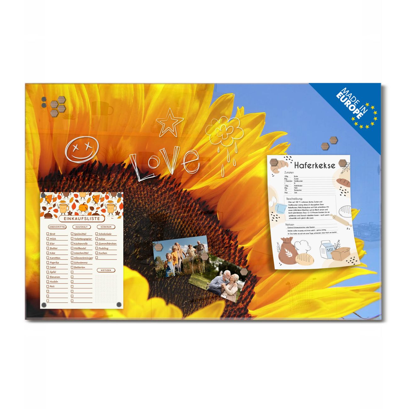 Ein Stück Design, das Ihren Alltag organisiert. Schreiben, heften, inspirieren - alles an einem Ort. Qualität, die man spürt. Montage leicht gemacht. Handwerk mit Herz - veredelt in Sachsen. Einzigartiges Design mit Motiv Motiv Sonnenblume Beschreibbare Glasoberfläche, leicht zu reinigen Starke Magnetkraft durch Stahlrückwand Inklusive 4 Neodym-Magneten Flexible Montageoptionen Handveredelt in Sachsen - Qualität, die bleibt