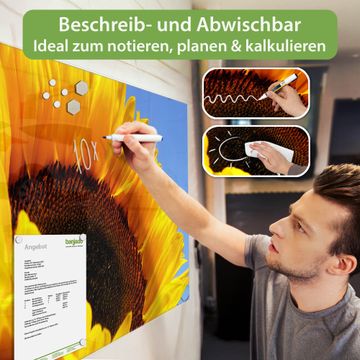 Die banjado Glas Magnettafel mit dem Motiv Motiv Sonnenblume verbindet Funktionalität mit Stil. Sie ersetzt das Zettelchaos durch klare Strukturen und bringt dabei eine warme, natürliche Atmosphäre in Ihr Zuhause. Ob im Büro, in der Küche oder im Eingangsbereich - dieses Design-Board zieht Blicke an und sorgt für Ordnung mit Charakter.