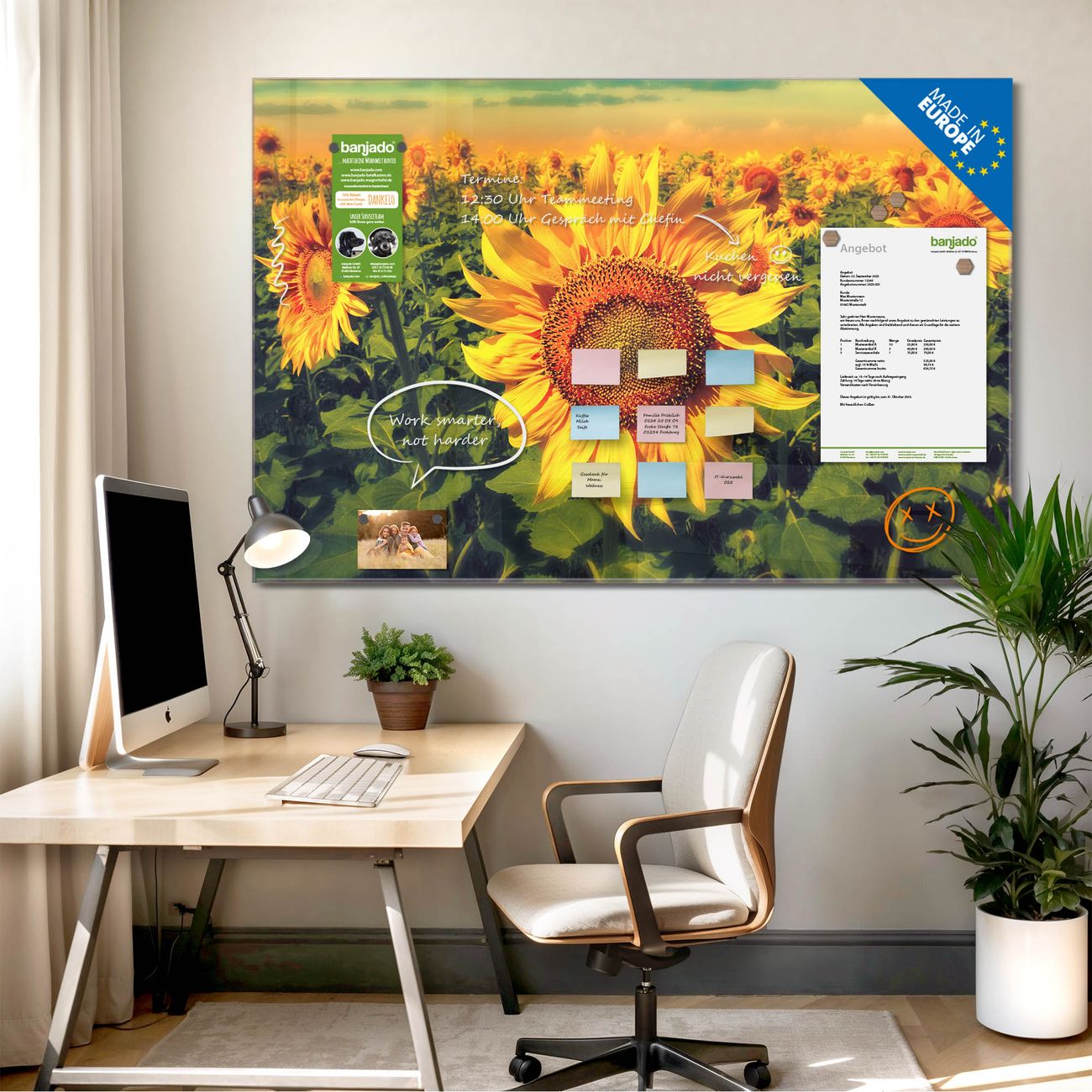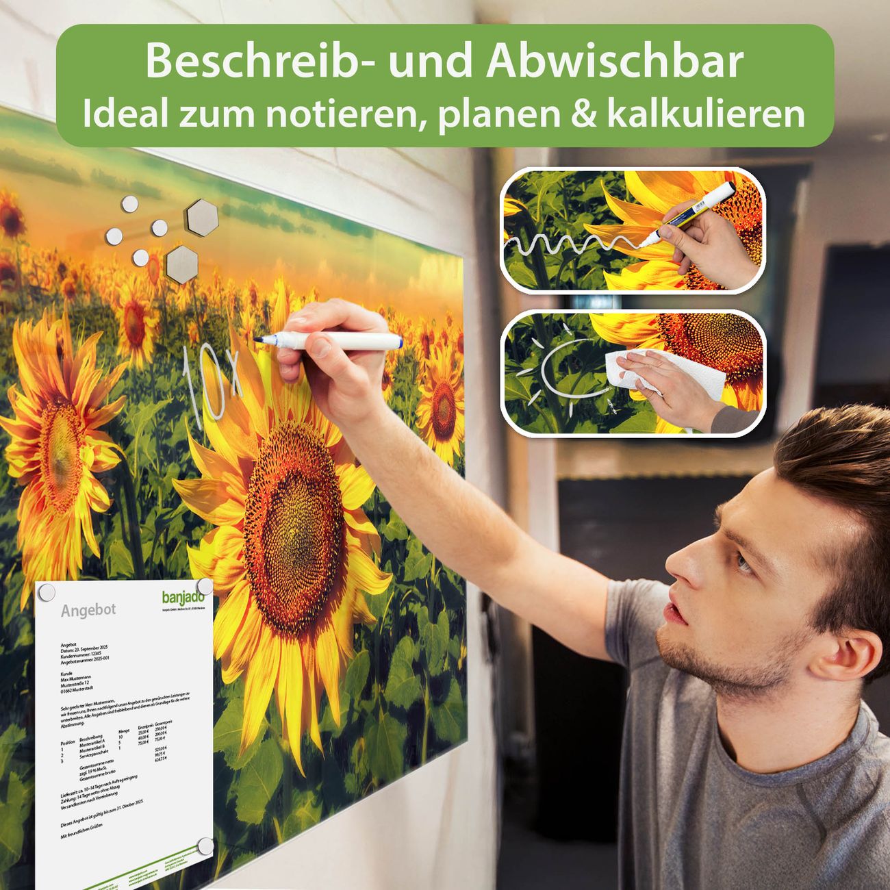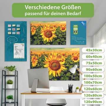 Die banjado Glas Magnettafel mit dem Motiv Motiv Sonnenblumen verbindet Funktionalität mit Stil. Sie ersetzt das Zettelchaos durch klare Strukturen und bringt dabei eine warme, natürliche Atmosphäre in Ihr Zuhause. Ob im Büro, in der Küche oder im Eingangsbereich - dieses Design-Board zieht Blicke an und sorgt für Ordnung mit Charakter.