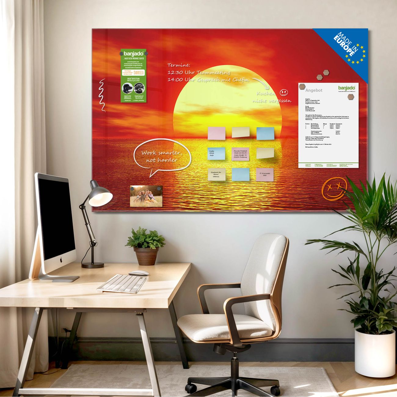Jede Glas Magnettafel wird in unserer Werkstatt von Hand gefertigt und sorgfältig geprüft. So erhalten Sie ein echtes Qualitätsprodukt, das Funktion und Ästhetik perfekt vereint.?? Warum banjado?