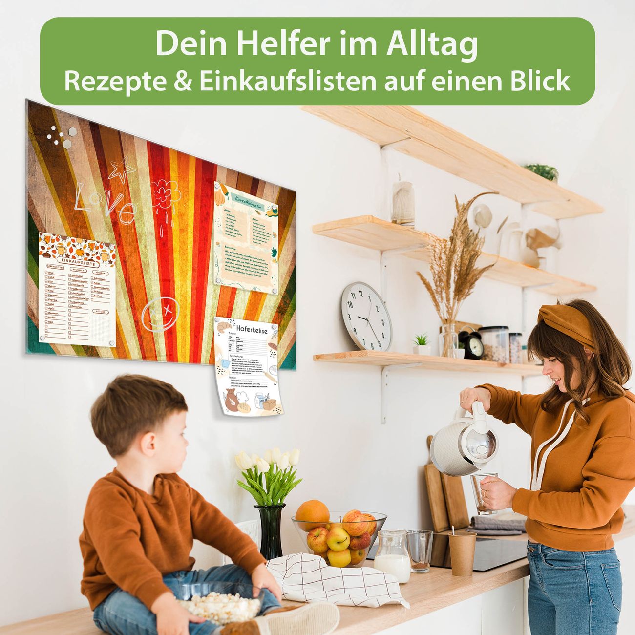 Auf der glatten Glasoberfläche lassen sich Termine, Rezepte oder Notizen ganz einfach mit Kreidestiften festhalten und rückstandslos entfernen. Starke Neodym-Magnete halten Ihre wichtigsten Erinnerungen sicher an Ort und Stelle. So entsteht Ihre ganz persönliche Ideenwand - jeden Tag neu.