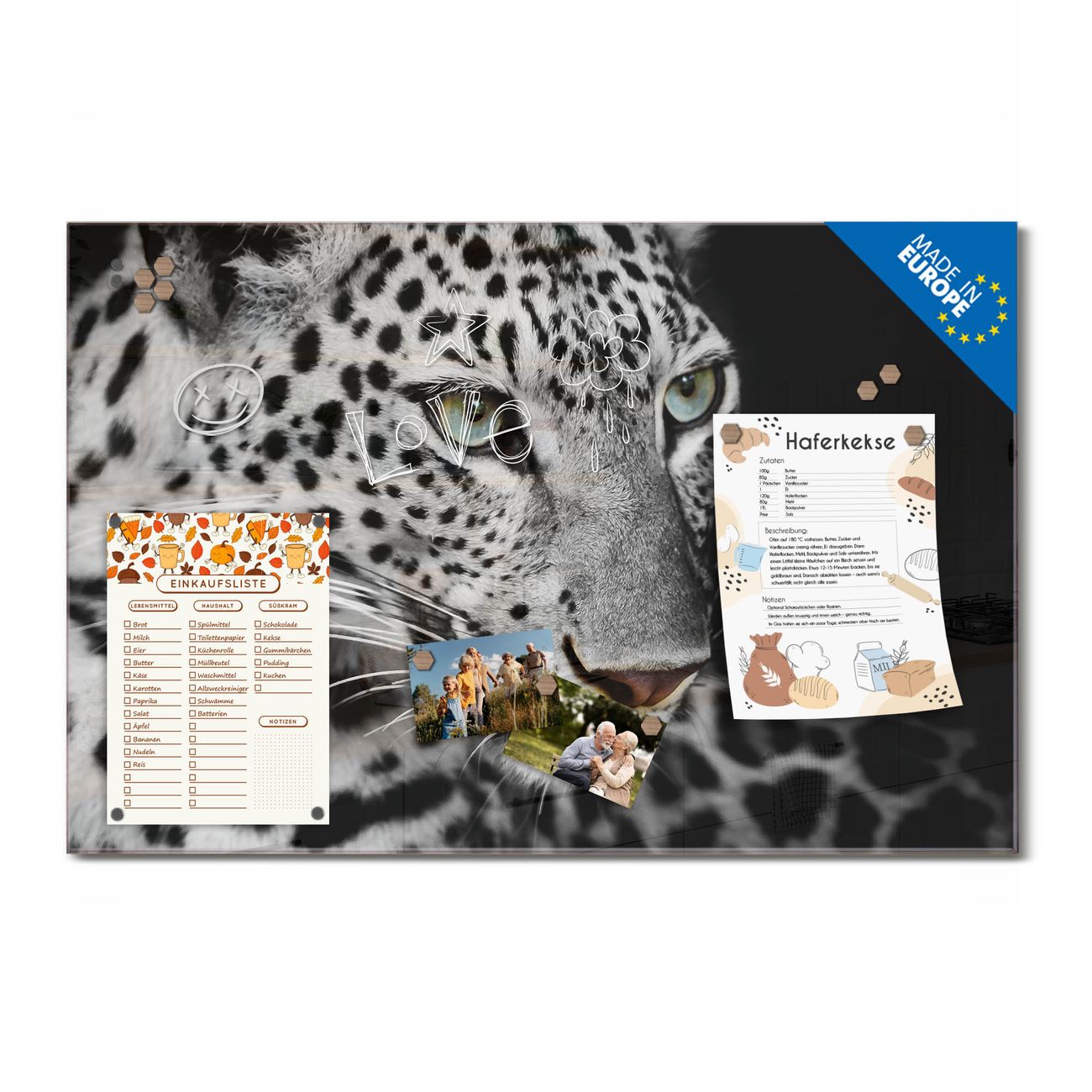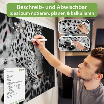 Auf der glatten Glasoberfläche lassen sich Termine, Rezepte oder Notizen ganz einfach mit Kreidestiften festhalten und rückstandslos entfernen. Starke Neodym-Magnete halten Ihre wichtigsten Erinnerungen sicher an Ort und Stelle. So entsteht Ihre ganz persönliche Ideenwand - jeden Tag neu.