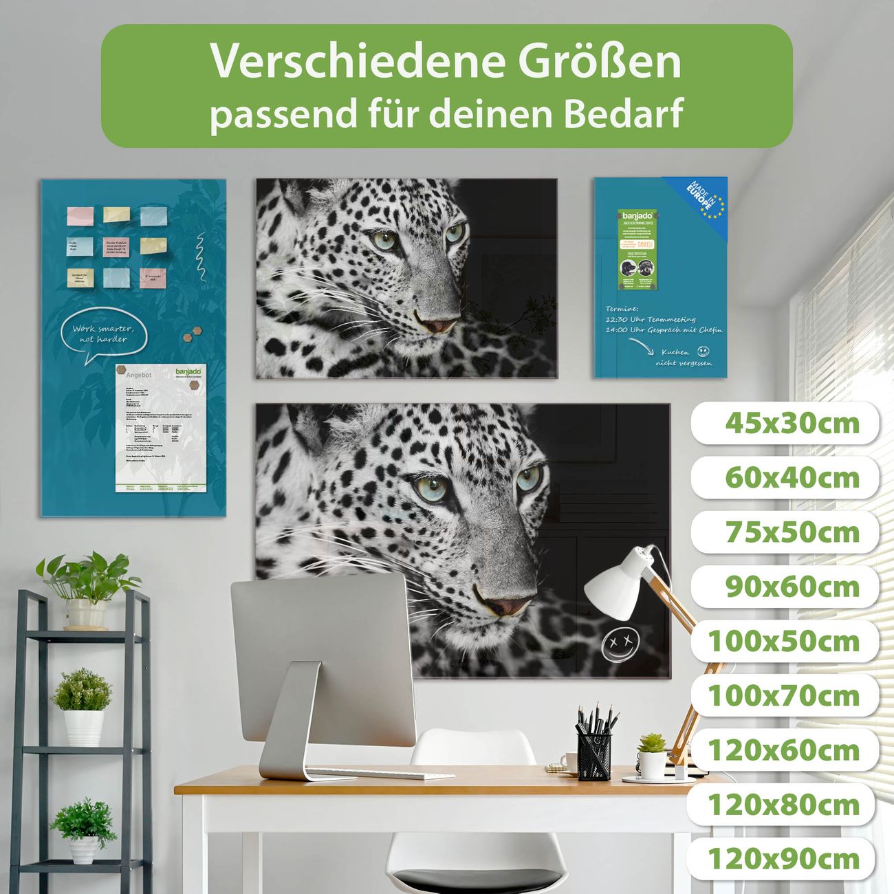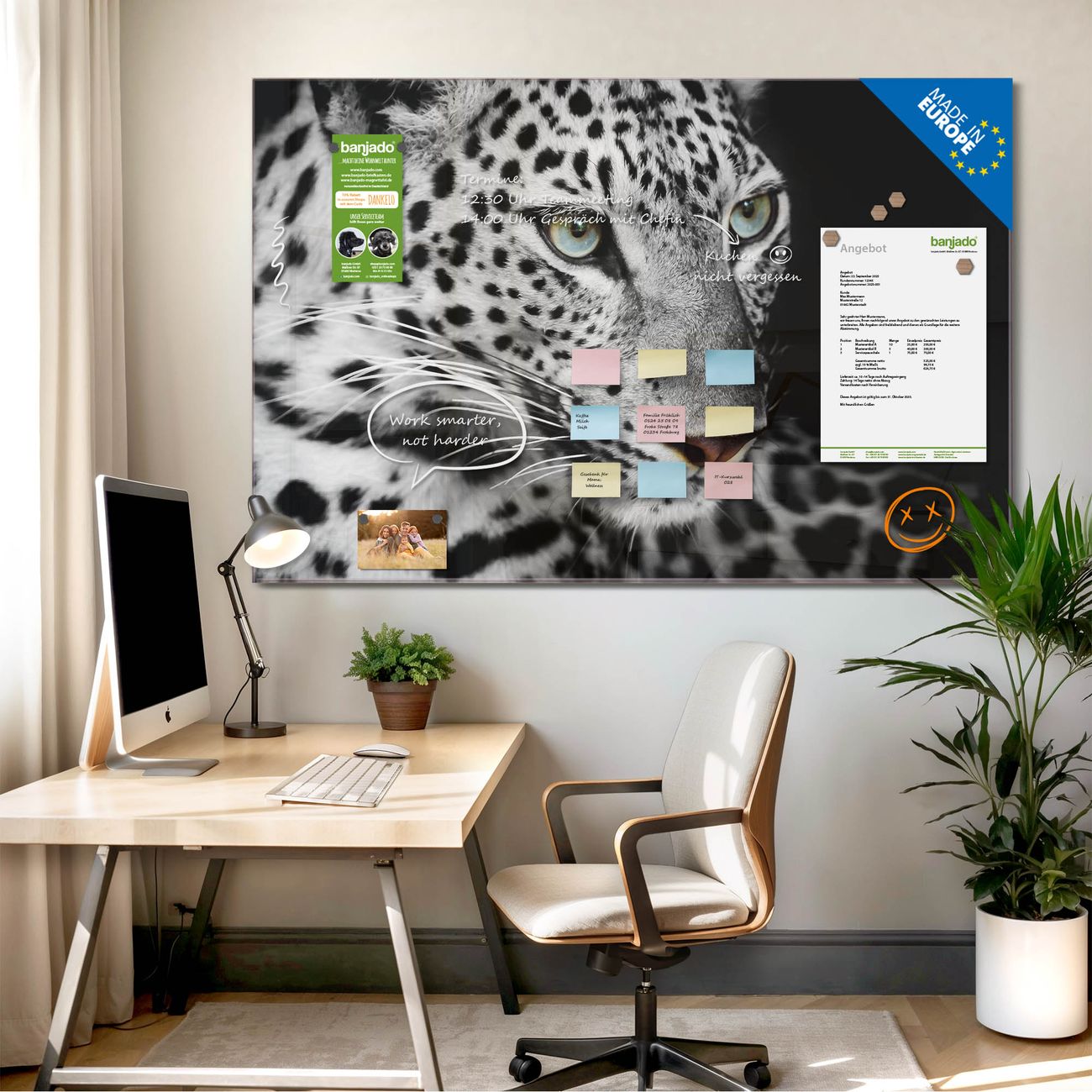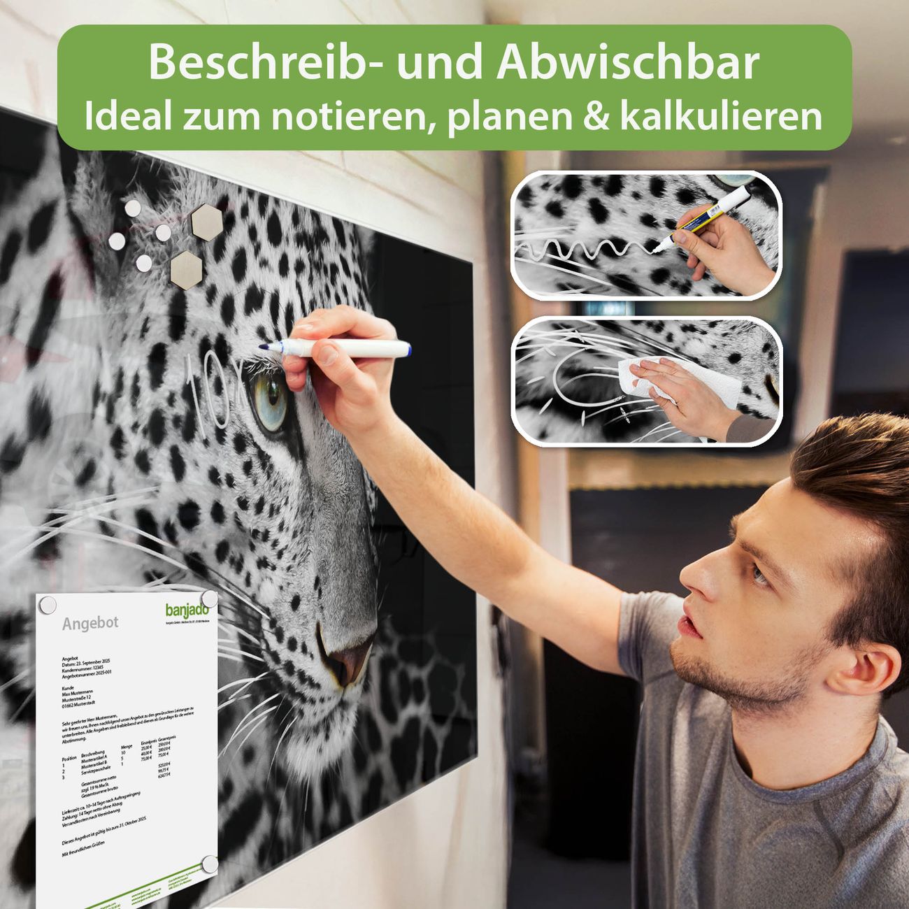 Jede Glas Magnettafel wird in unserer Werkstatt von Hand gefertigt und sorgfältig geprüft. So erhalten Sie ein echtes Qualitätsprodukt, das Funktion und Ästhetik perfekt vereint.?? Warum banjado?