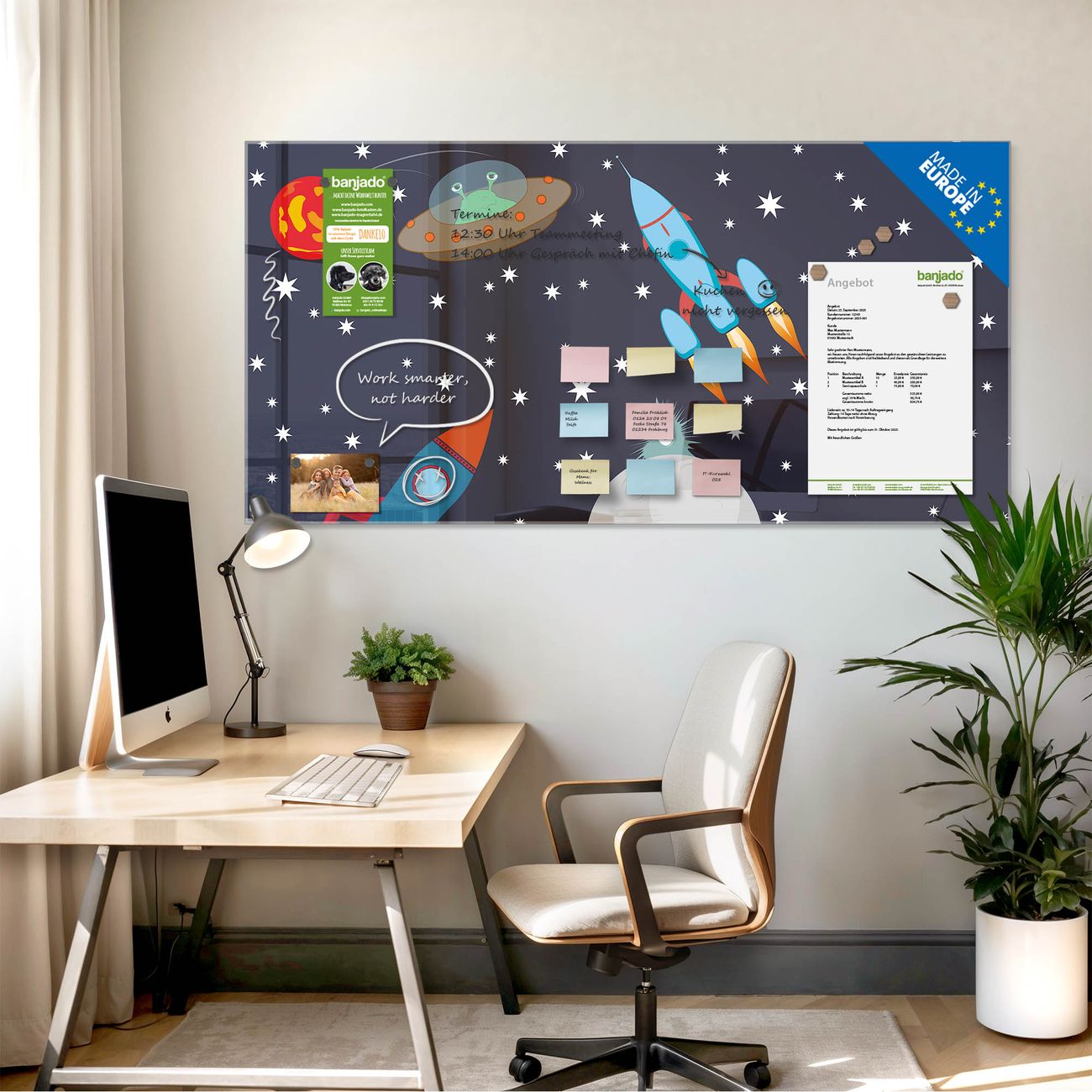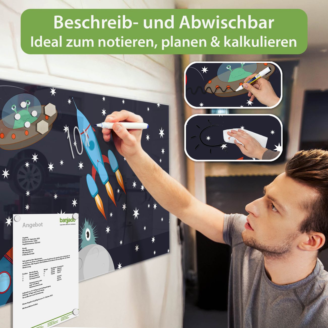 Jede Glas Magnettafel wird in unserer Werkstatt von Hand gefertigt und sorgfältig geprüft. So erhalten Sie ein echtes Qualitätsprodukt, das Funktion und Ästhetik perfekt vereint.?? Warum banjado?