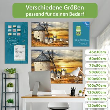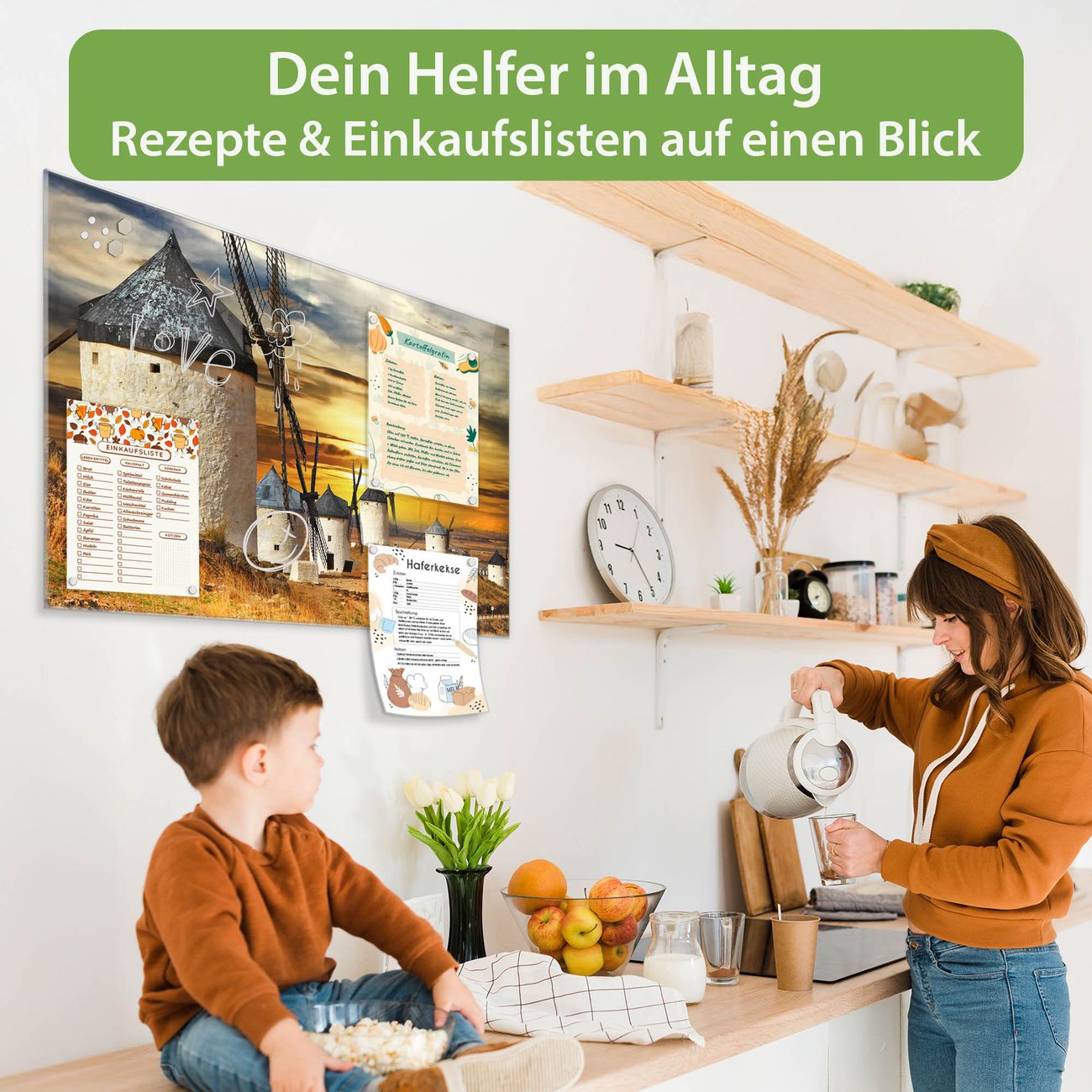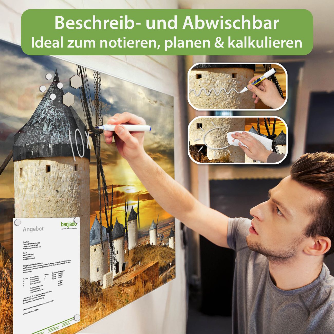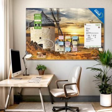 Die banjado Glas Magnettafel mit dem Motiv Motiv Spanische Windmühlen verbindet Funktionalität mit Stil. Sie ersetzt das Zettelchaos durch klare Strukturen und bringt dabei eine warme, natürliche Atmosphäre in Ihr Zuhause. Ob im Büro, in der Küche oder im Eingangsbereich - dieses Design-Board zieht Blicke an und sorgt für Ordnung mit Charakter.