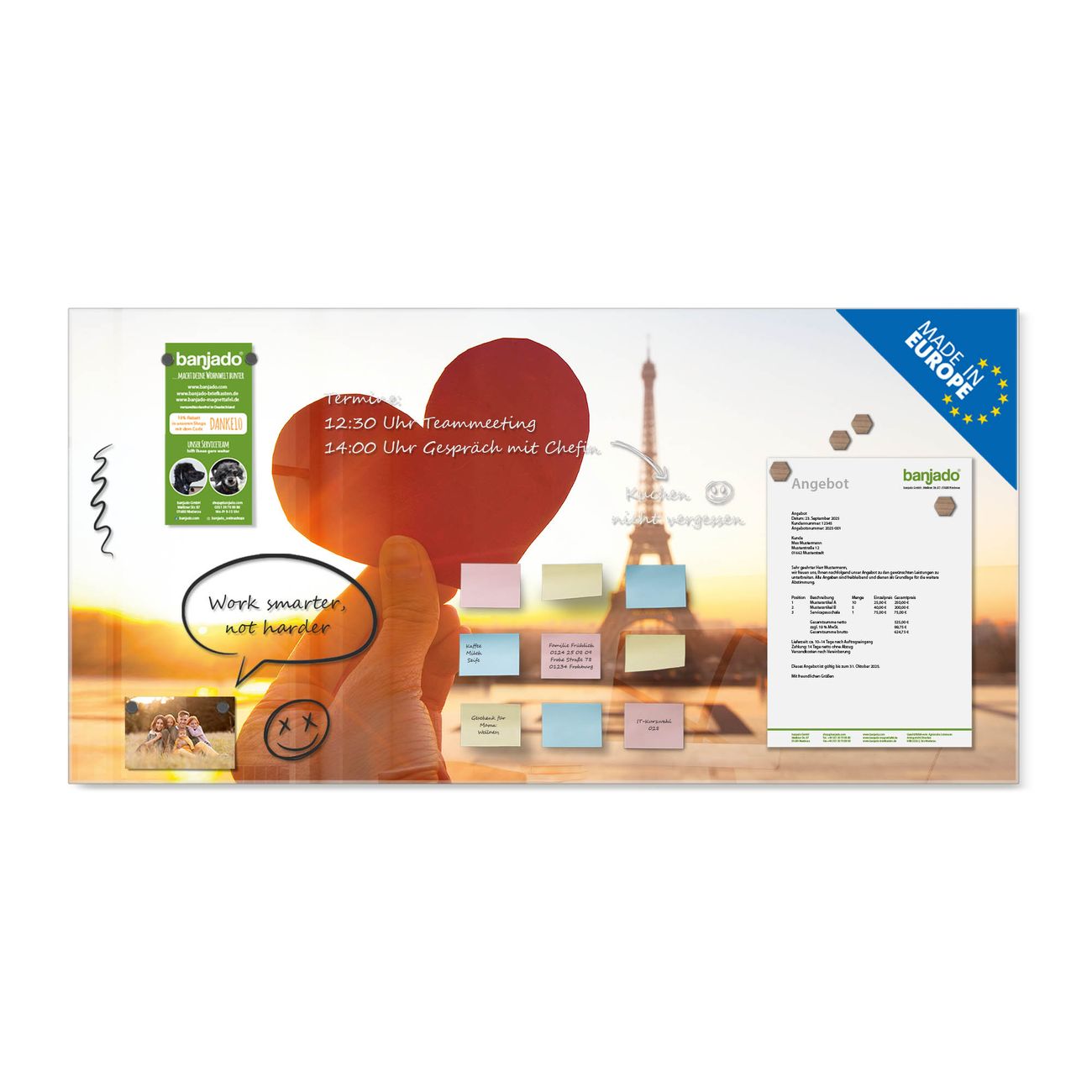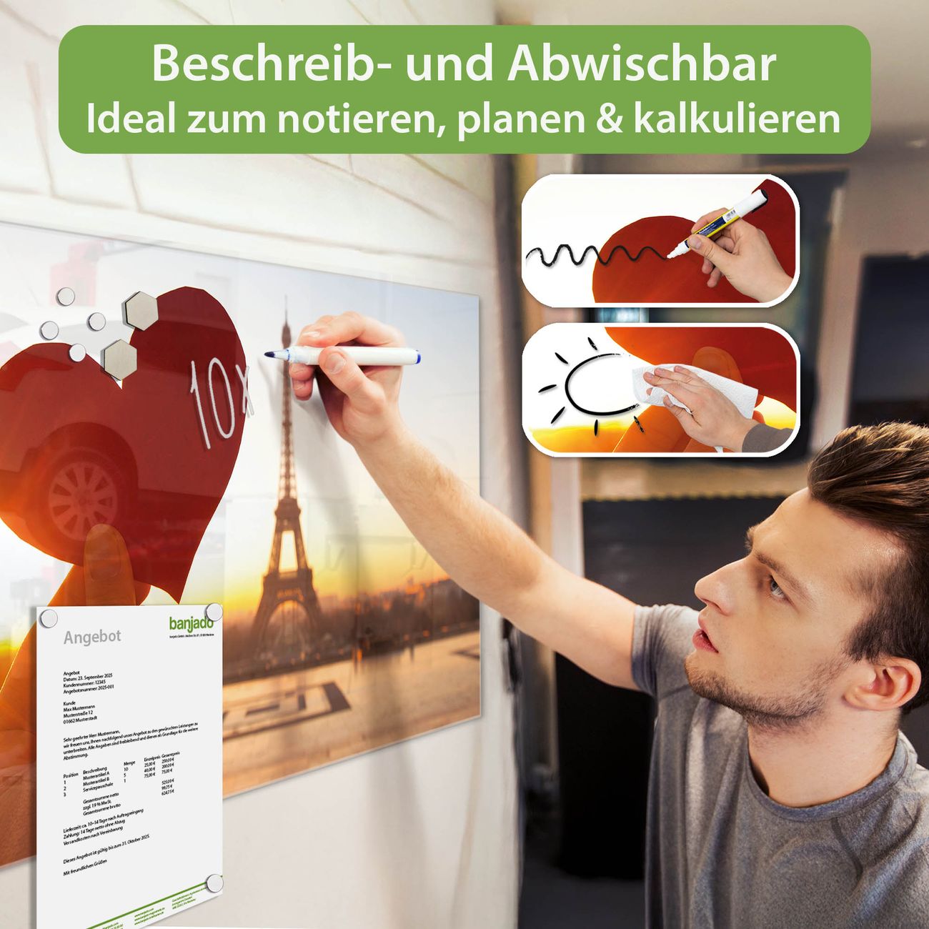 Die banjado Glas Magnettafel mit dem Motiv Motiv Stadt Der Liebe verbindet Funktionalität mit Stil. Sie ersetzt das Zettelchaos durch klare Strukturen und bringt dabei eine warme, natürliche Atmosphäre in Ihr Zuhause. Ob im Büro, in der Küche oder im Eingangsbereich - dieses Design-Board zieht Blicke an und sorgt für Ordnung mit Charakter.